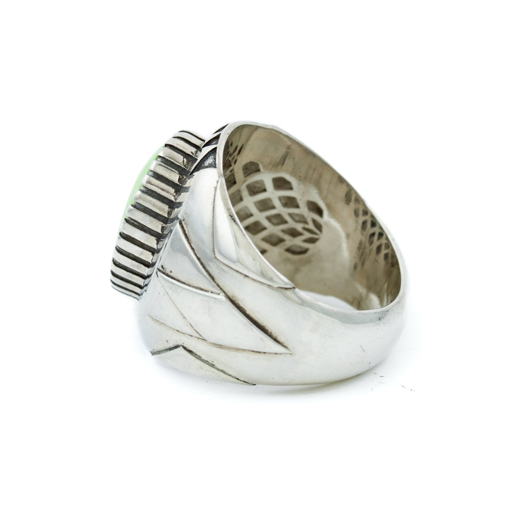 This contemporary Art Deco influenced geometric ring by Kingdom is truly something special! The exquisite Lemon Chrysoprase stone which is surrounded by a sterling silver hand cut bezel is unique and striking. A statement ring that would look killer paired with any of your other favorite gems or works perfectly as a stand-alone piece!