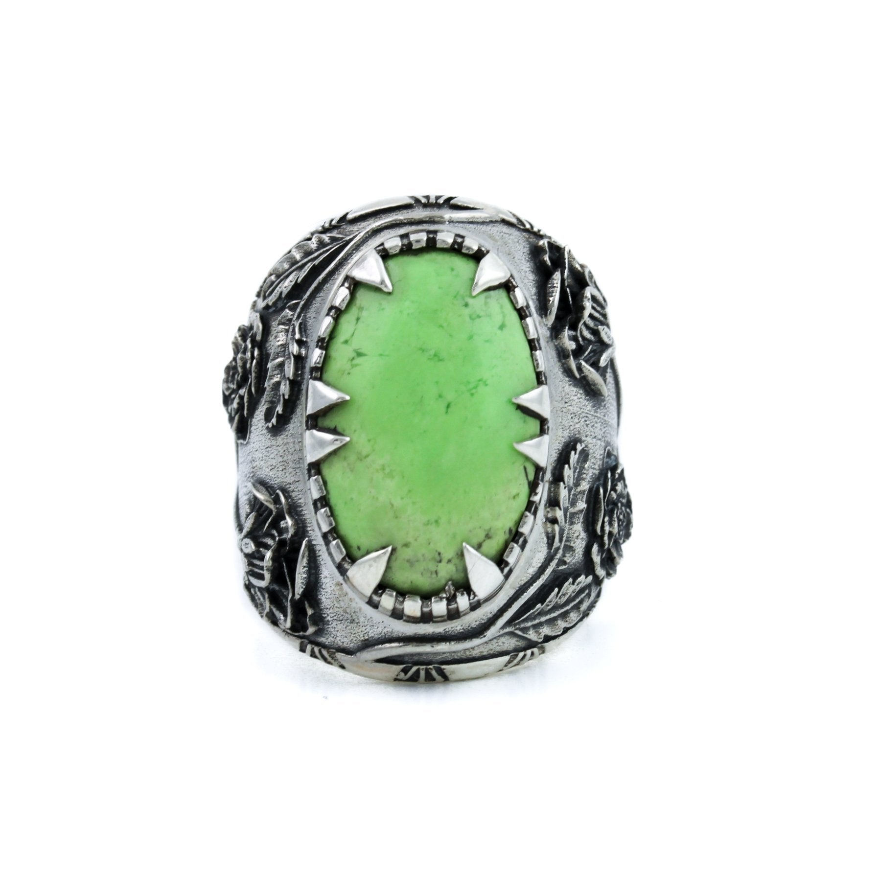 This impressive statement piece features killer high-detail etching and a heavy patina perfectly matched to a radiant piece of natural lemon Chrysoprase. Complimented by intricate silver work that depicts a rose vine tattoo-style designs made in mind for someone who values the big, bold and beautiful. This piece will surely become one of the most treasured within your collection.