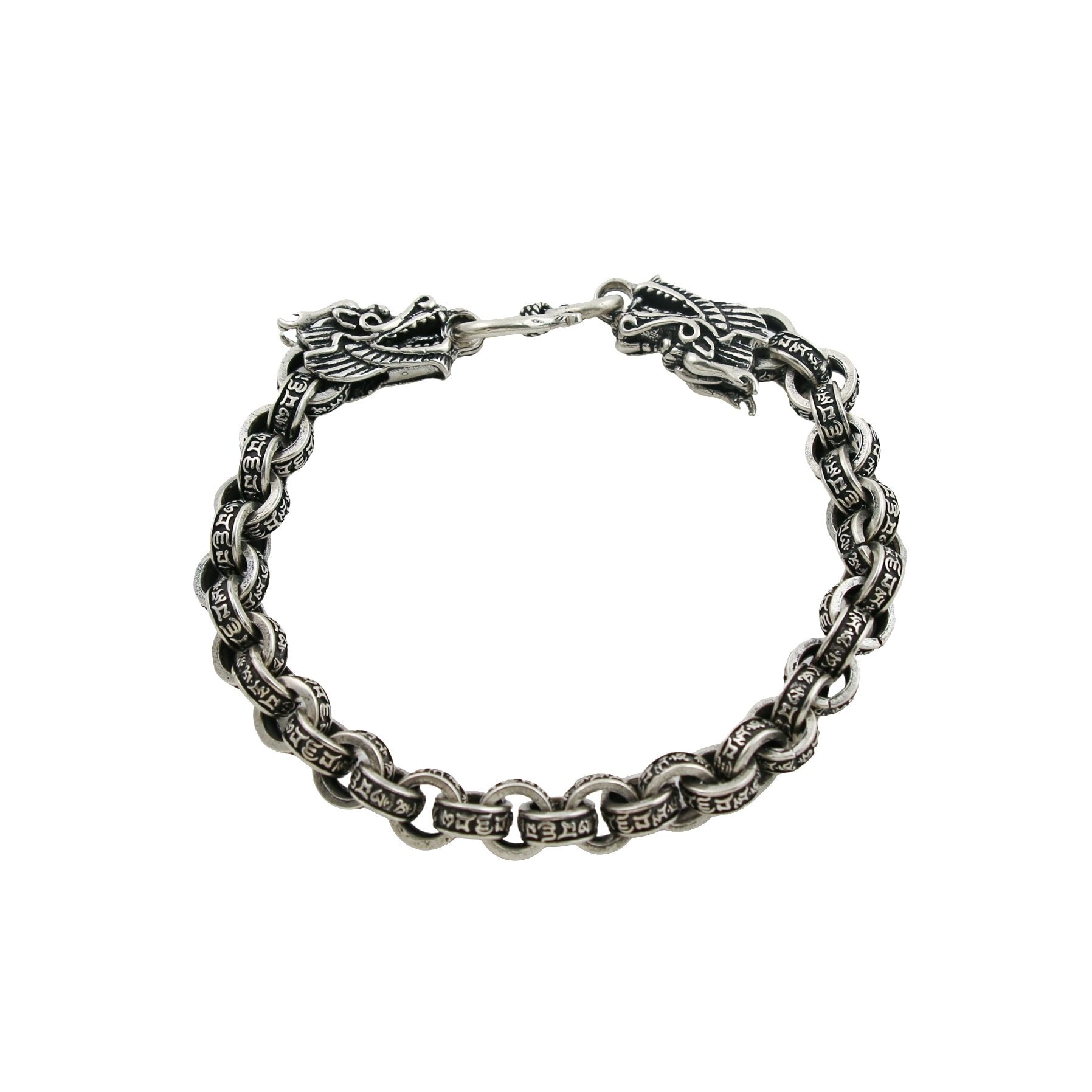 This sterling silver chain bracelet is a powerful and elegant piece of jewelry. The intricate links are expertly crafted, with a double dragon head clasp as the centerpiece.