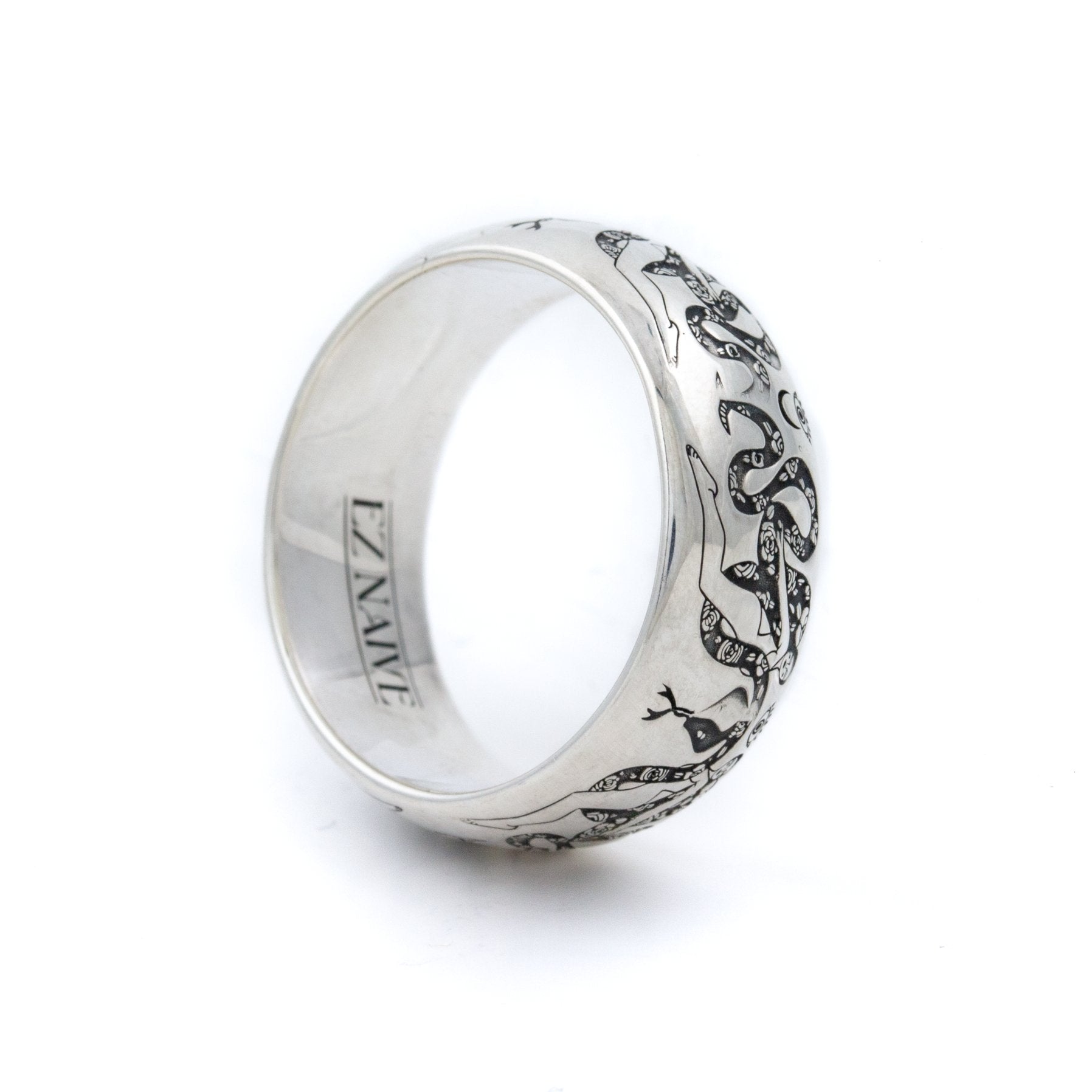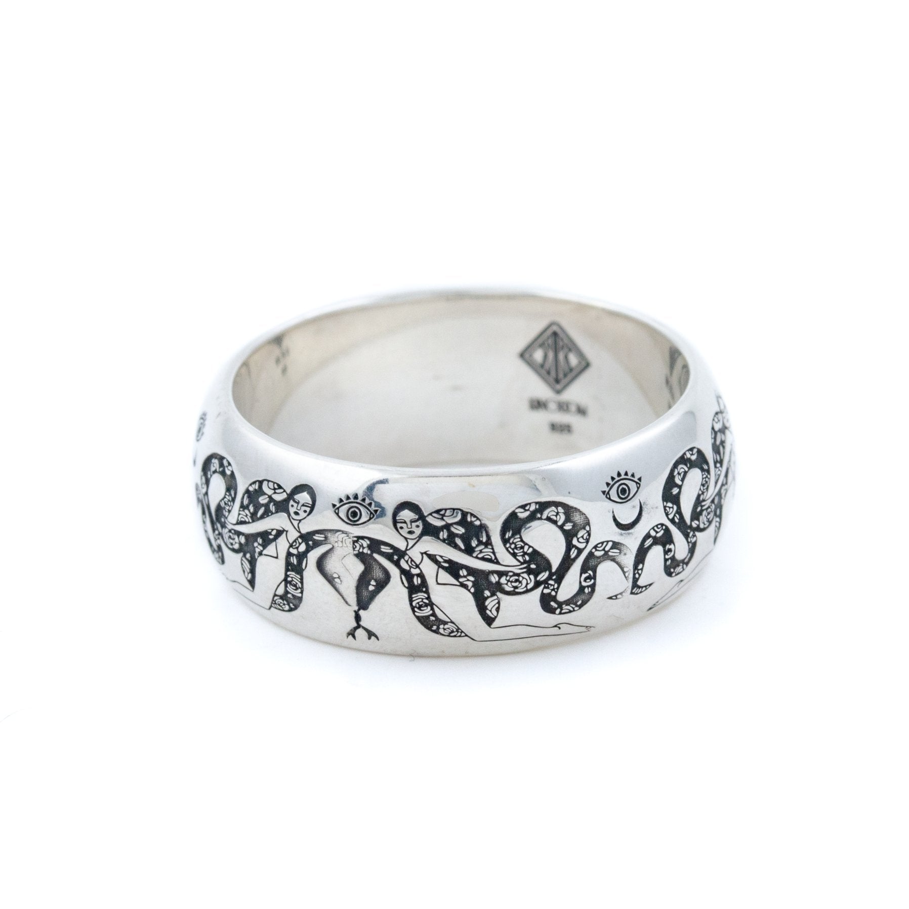 An beautiful sterling silver band made in collaboration with EZ Naive. Featuring a woman holding a two snakes. Featuring snakes intertwined around the band. Inspired by Minoan art. Cast in sterling silver this piece is one to be coveted for years to come!