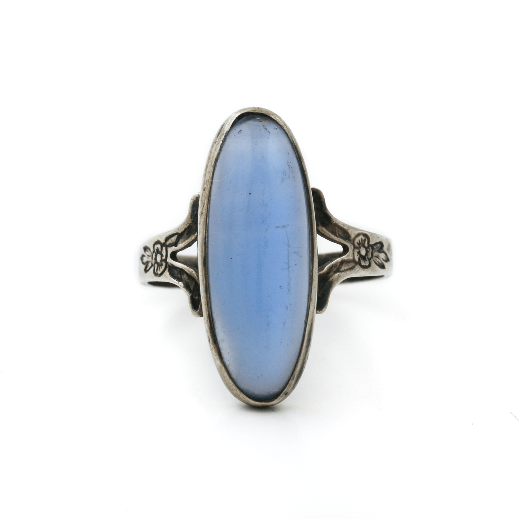 Delicate and dreamlike, this vintage Navajo ring features a long, domed blue glass stone set in a fine sterling silver frame. The elongated silhouette gently hugs the finger, while the soft curvature of the glass catches the light with a subtle, watery glow.