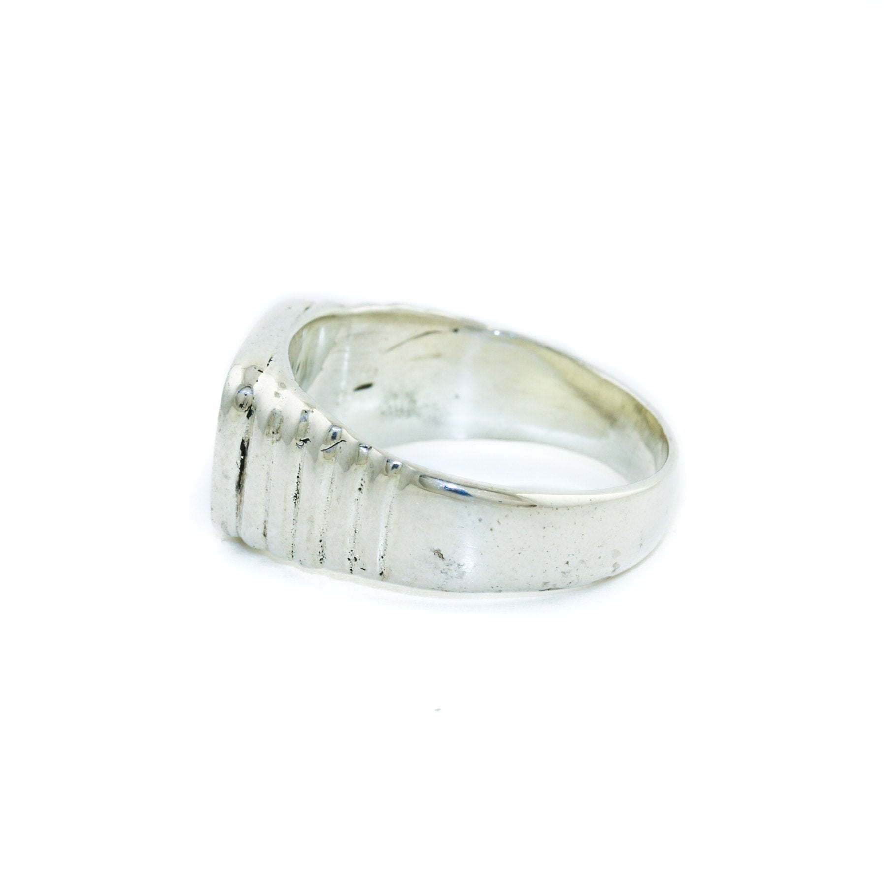 A contemporary inlay signet ring, featuring an chatonyant cut of Pietersite in a sleek setting. Comprised of sterling silver, this handmade piece has a ridged textured shank that showcases a beautifully serene specimen that's perfect for everyday wear.