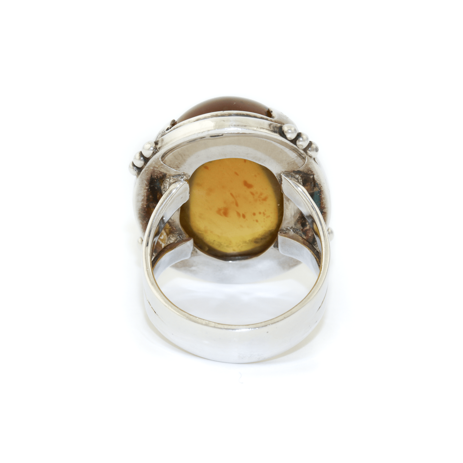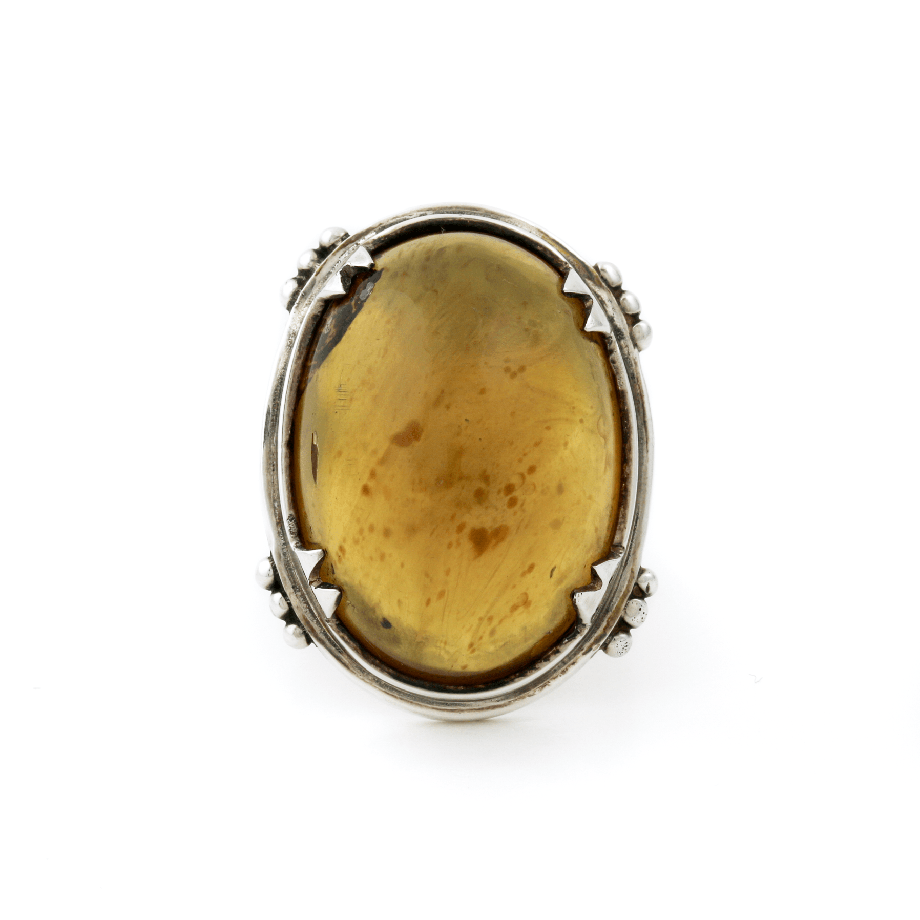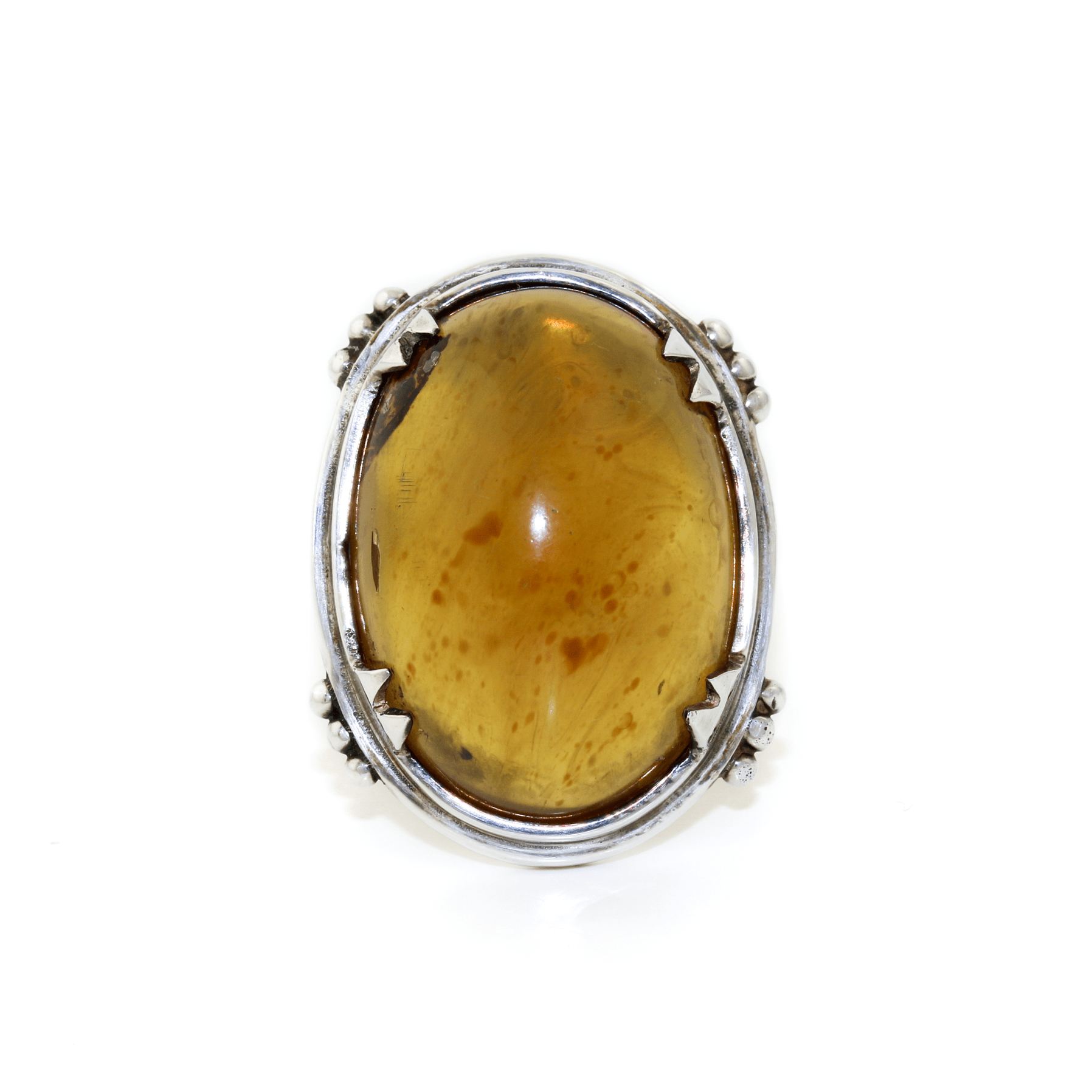 This beautiful natural deep rich Indonesian amber is surrounded by a sterling silver claw set bezel which together, makes this a lovely power piece. This contemporary ring would look great paired with any of your favorite gems! A great piece to add to any collection!