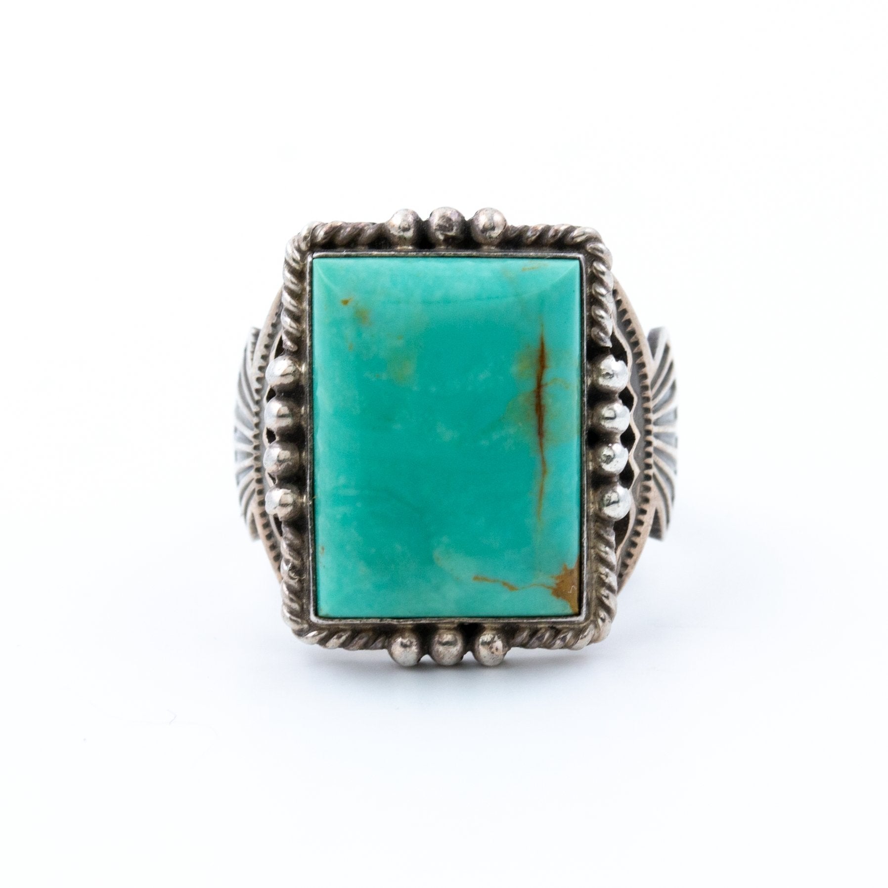 Contemporary turquoise ring by M&R Caladitto featuring a rectangular piece of turquoise and classic stampwork. braided rope detailing and bubbling.