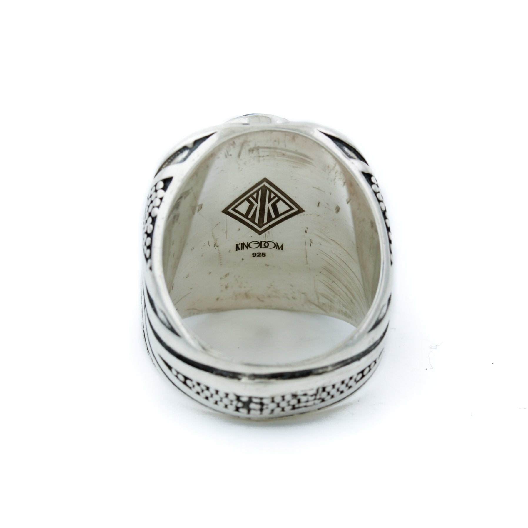 Art deco piece made by Turquoise Kingdom with a vintage 1970s feel. This is a large, eye-catching piece with beautiful silver work that features a nice two-toned Hubei Turquoise as it's centrepiece. A dreamy and powerful ring, the perfect statement piece to add to a collection or to rock on it's own.