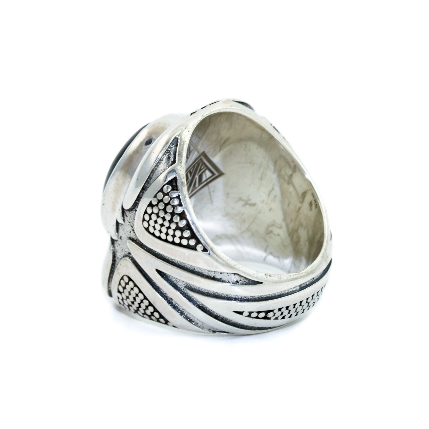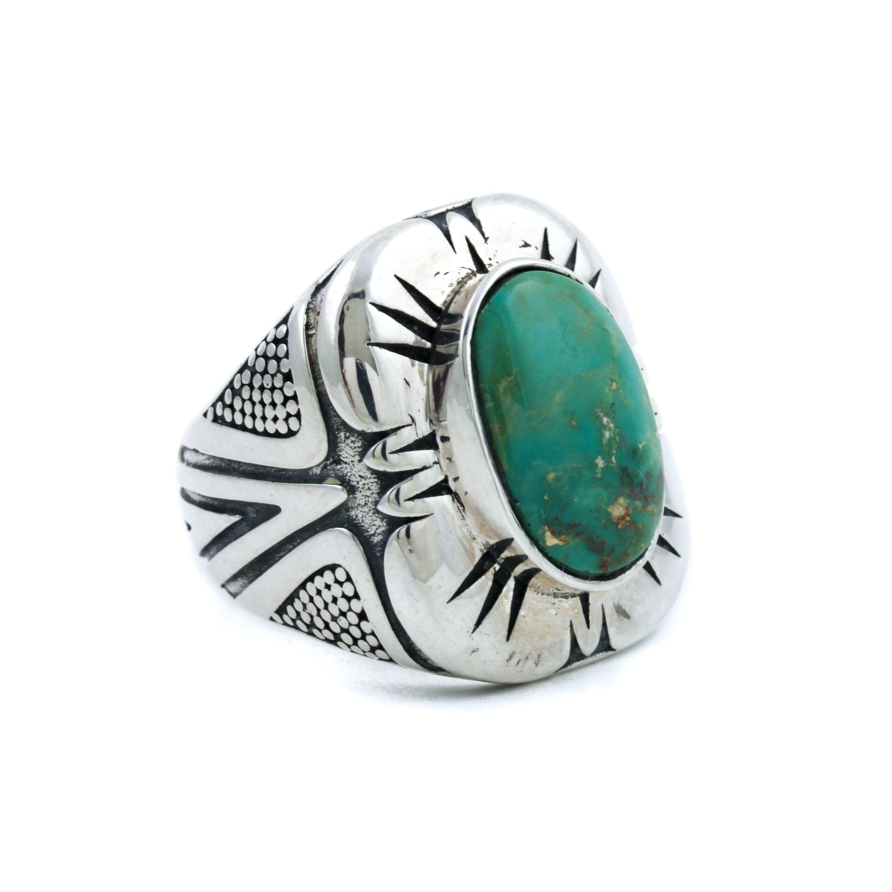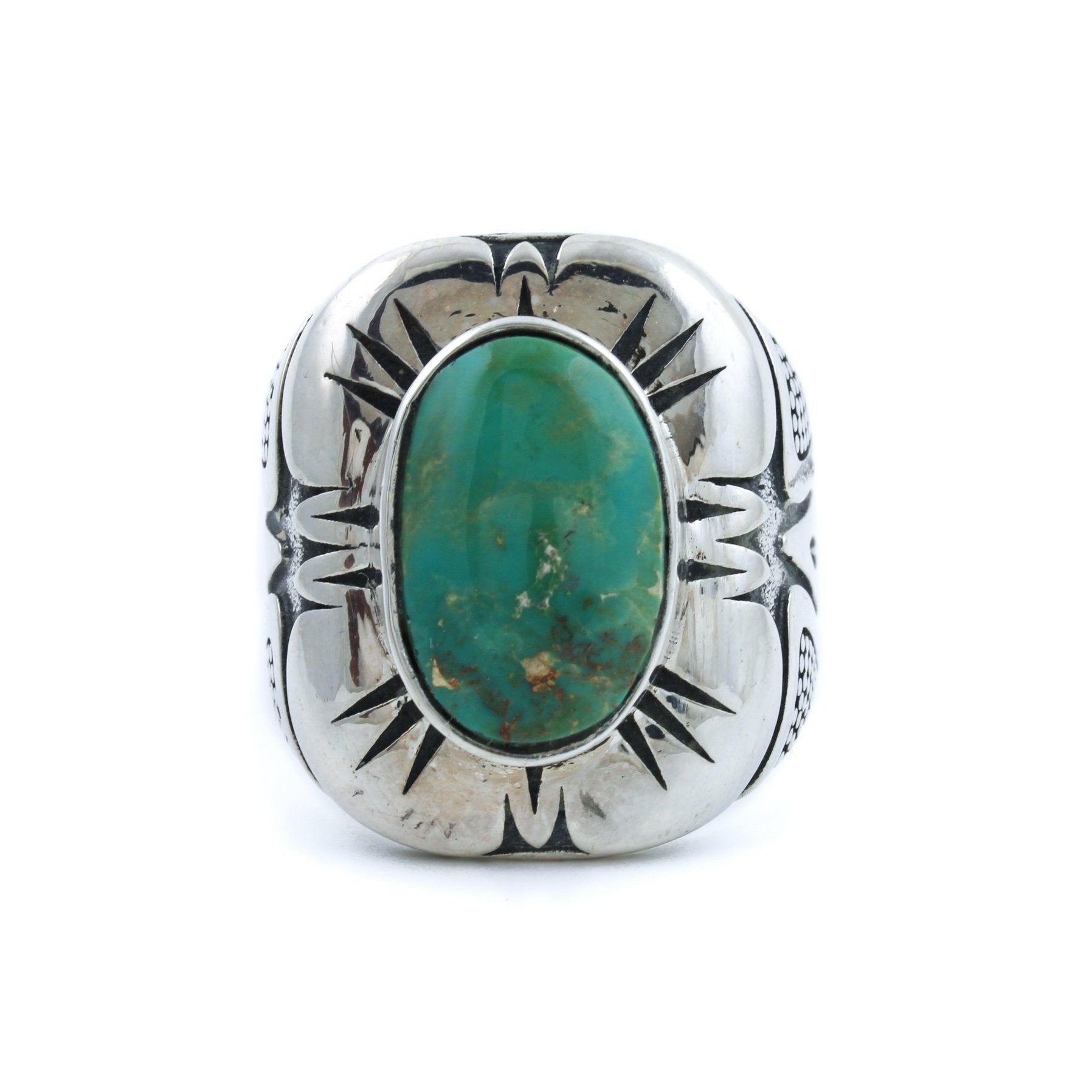 Art deco piece made by Turquoise Kingdom with a vintage 1970s feel. This is a large, eye-catching piece with beautiful silver work that features a high-grade of Varascite as it's centrepiece. A dreamy and powerful ring, the perfect statement piece to add to a collection.