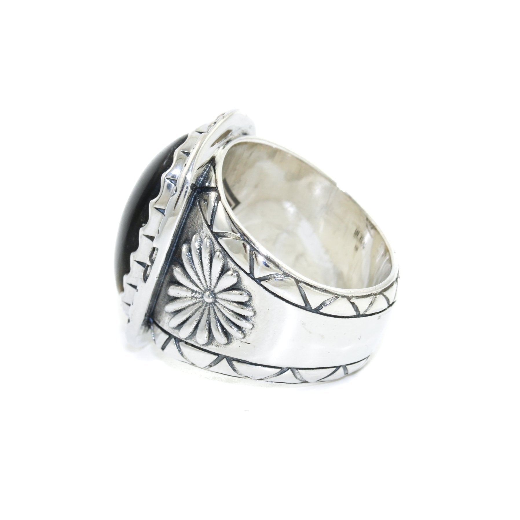 This contemporary Art Deco-influenced geometric ring by Kingdom is truly something special! A Blue Tiger's eye stone, which is surrounded by a sterling silver hand-cut bezel, is unique and striking. Each stoned used in our rings is a one-of-one piece. This particular piece of tiger's eye is half gold and half blue in different lighting. A true heirloom piece. This statement ring would look killer paired with any of your other favourite gems or works perfectly as a stand-alone piece!
