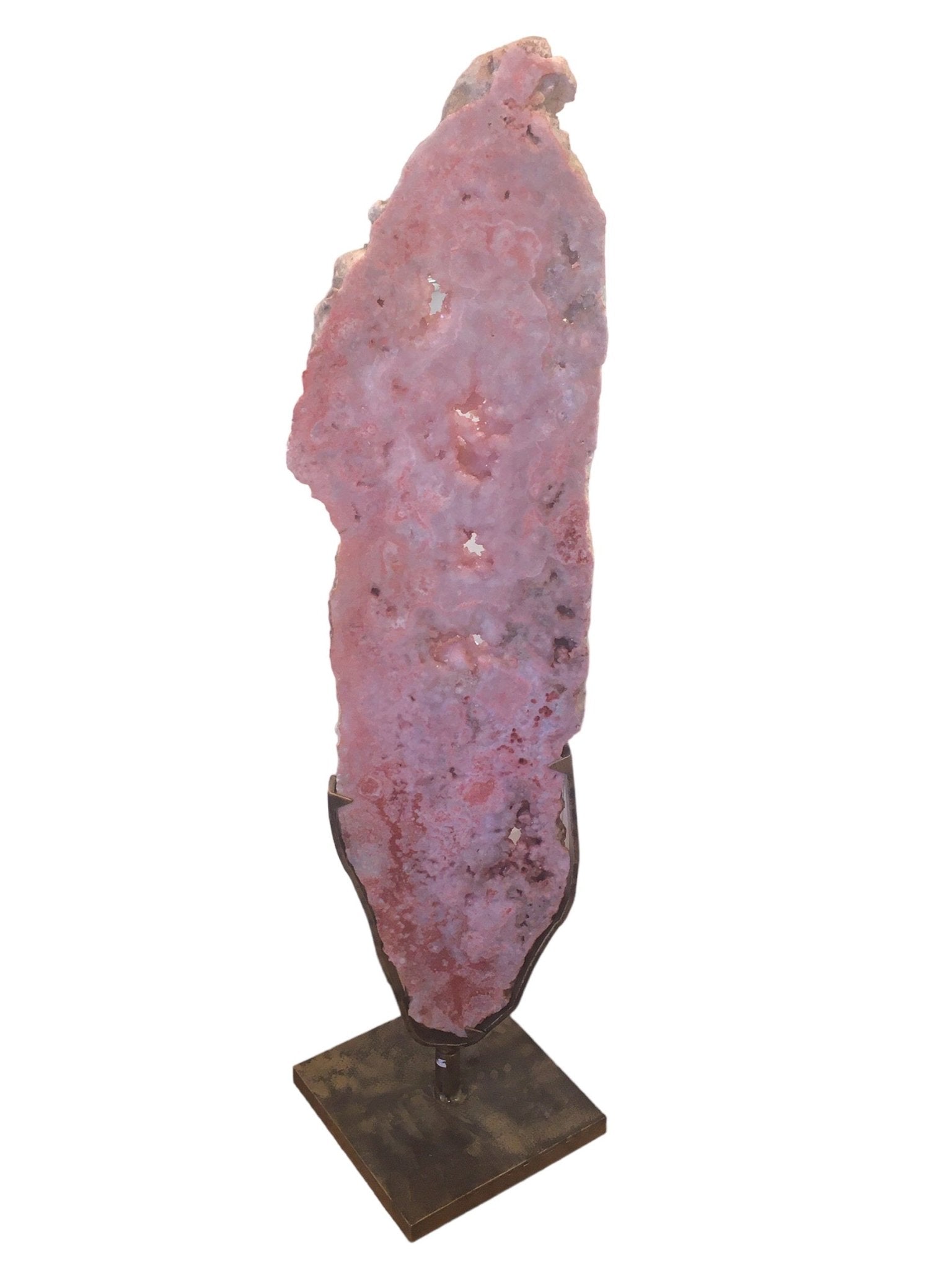 Presenting a remarkable giant pink agate specimen: a four foot tall slab of gem-quality pink agate from Tuscon, Arizona. This rare piece is securely set and framed within an adjustable brass display stand with swivel capablities for maximum showcase within you dwelling or workspace. Its captivating beauty and scarcity make it highly coveted no to be missed.