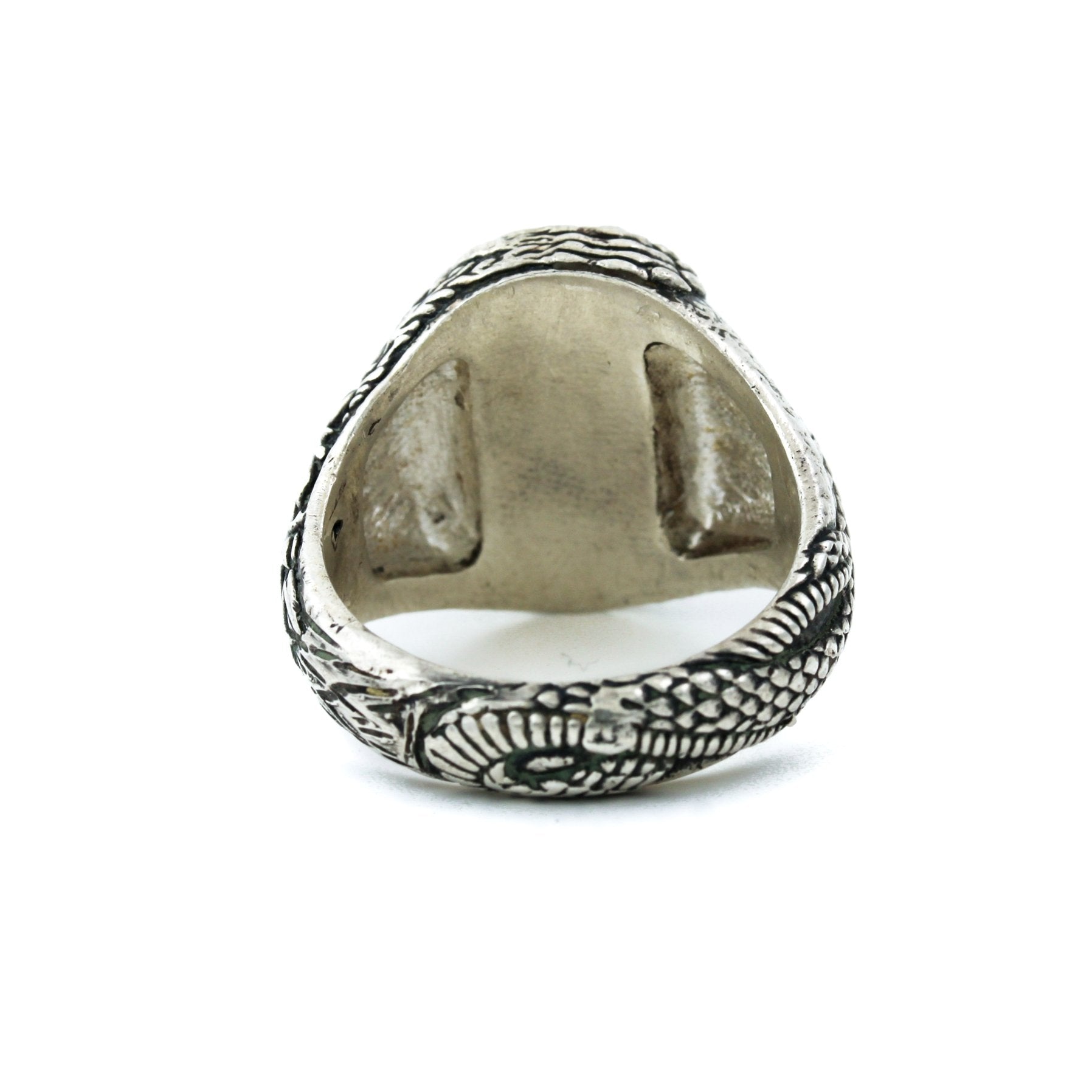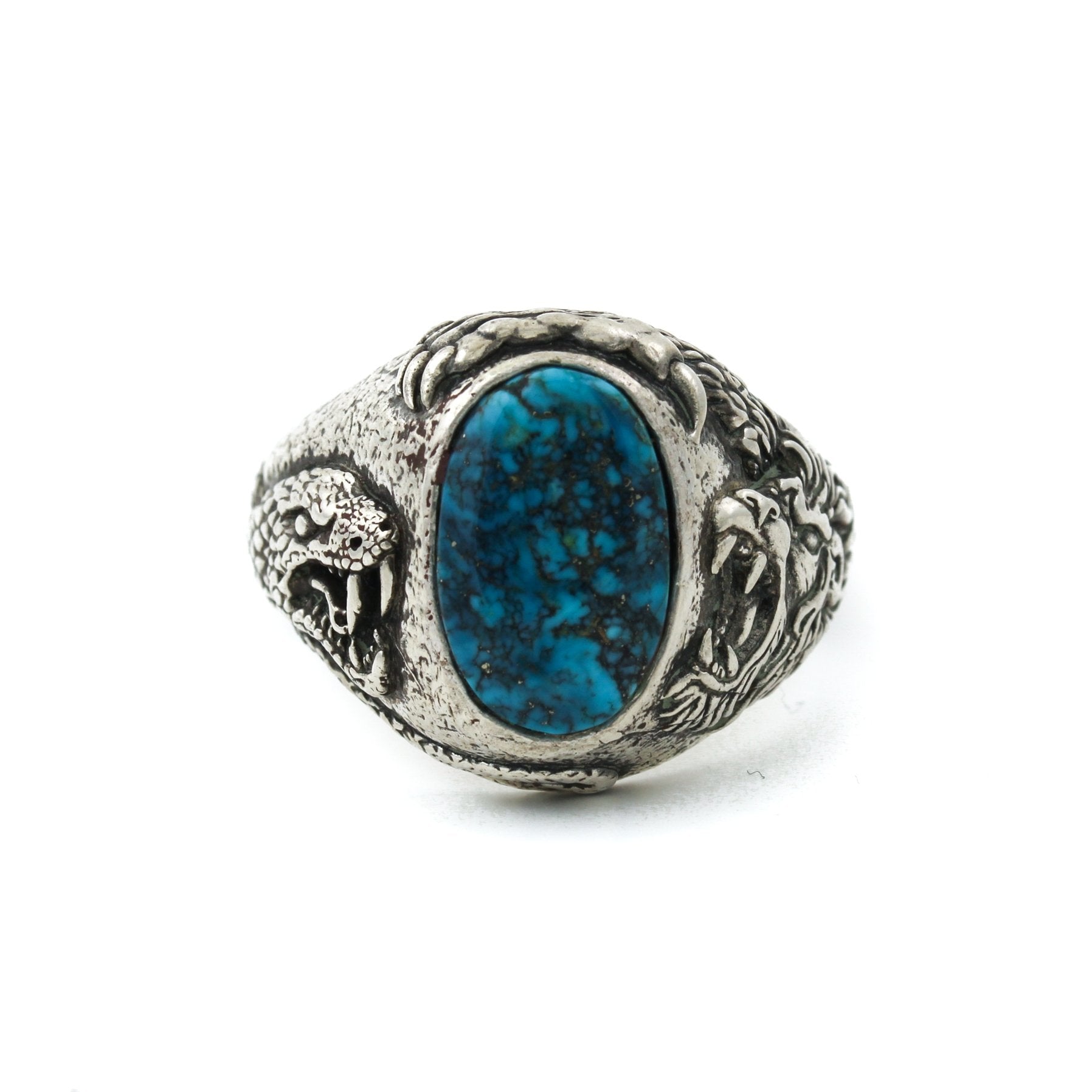 Apart of our new menswear collection, featuring quality stones and heavy silver. This ring has a beautiful piece of Morenci turquoise, flanked by a snake and a tiger design on the band. Perfect piece to wear solo, or stacked all the way up!