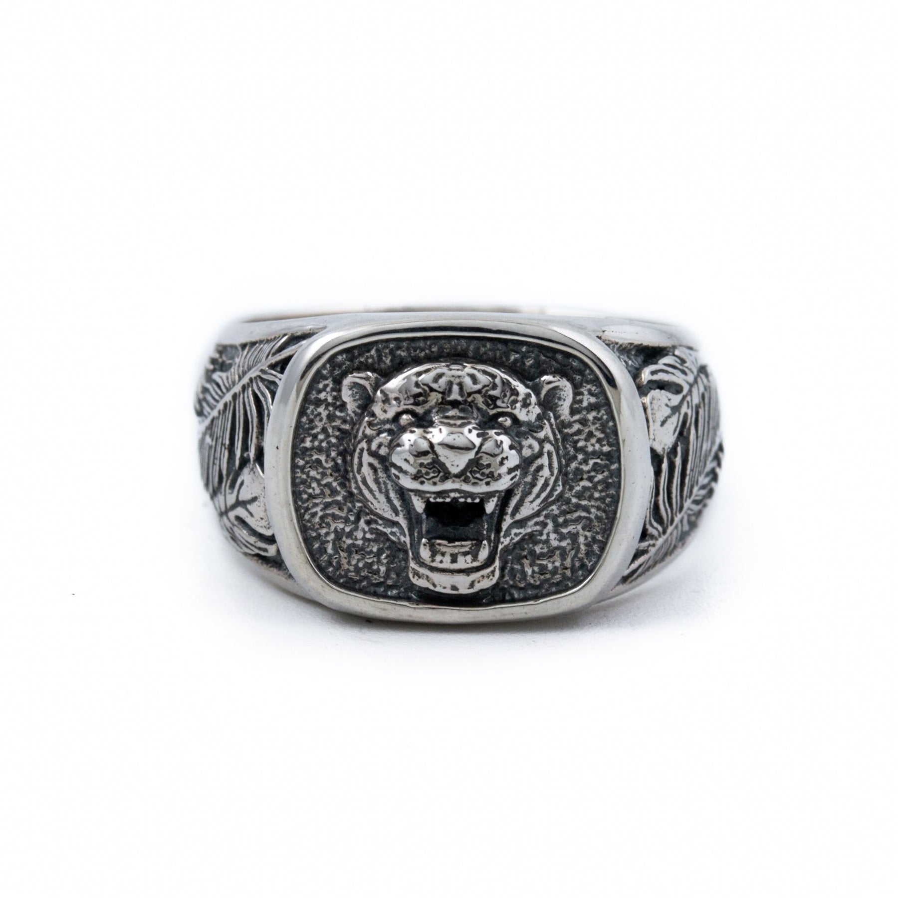 This signet ring showcases intricate silver work detailed with jungle plants along the shank framing a killer tiger head creating a beautiful and interesting piece. This ring will surely become one of the most treasured within your collection.