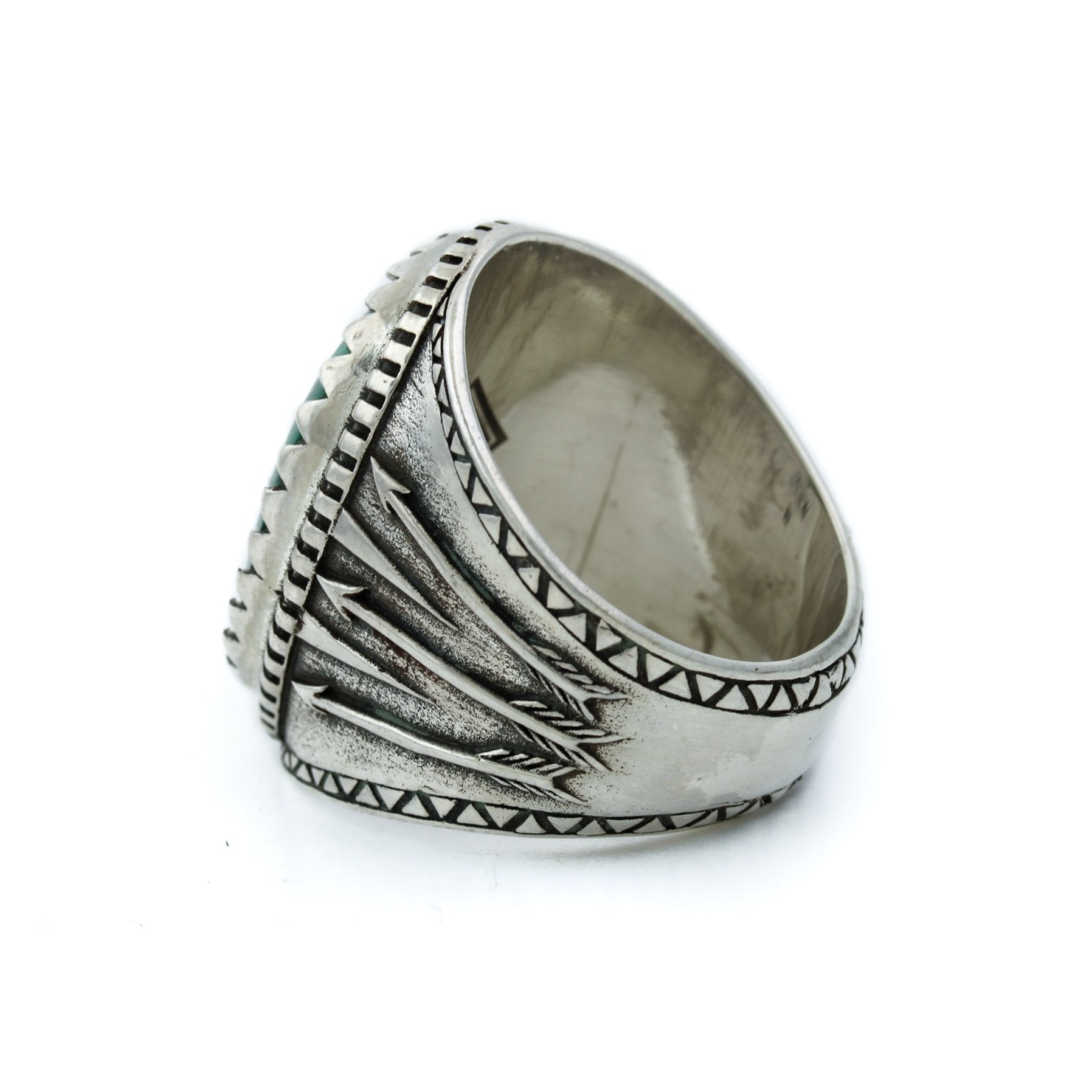 This contemporary arrow motif ring by Kingdom Jewelry is truly something special! The striking Malachite is surrounded by a sterling silver hand cut bezel and set in a thick comfortable shank. A statement ring that would look killer paired with any of your other favourite gems or works perfectly as a stand-alone piece!