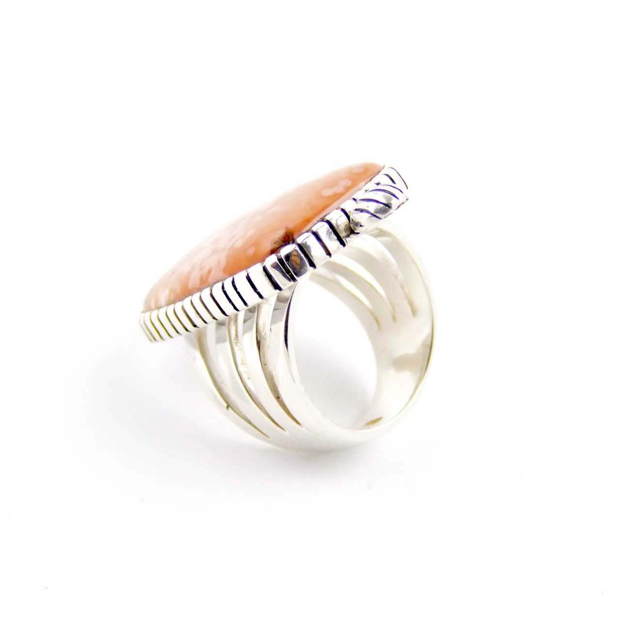 This ring features, a stunning piece of natural high grade ocean jasper paired with a hand cut bezel and ornate silver orbs. The simple design with the wide silver band create a powerful piece that is timeless.