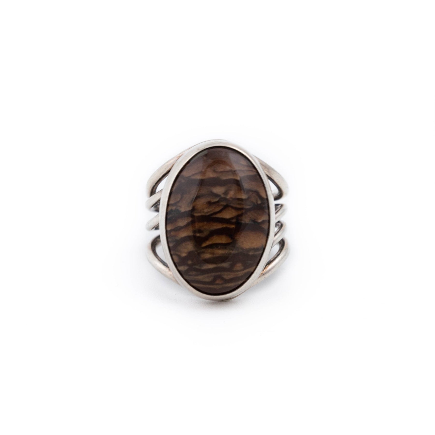 Simple silver and jasper Southwest ring. The striking natural stone has layers of browns throughout. A great way to show off nature's beauty. Perfect for everyday wear!