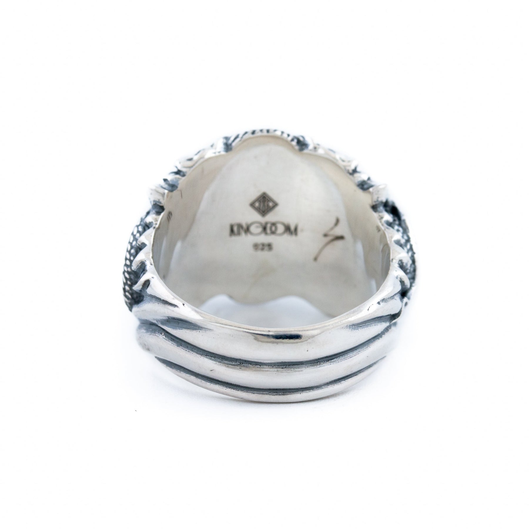 Bold and detailed gold ring made by Water Street Phantom in collaboration w/ Kingdom Jewelry featuring a modern take on the most famous Serpent Queen from Ancient Greek mythology, Medusa.