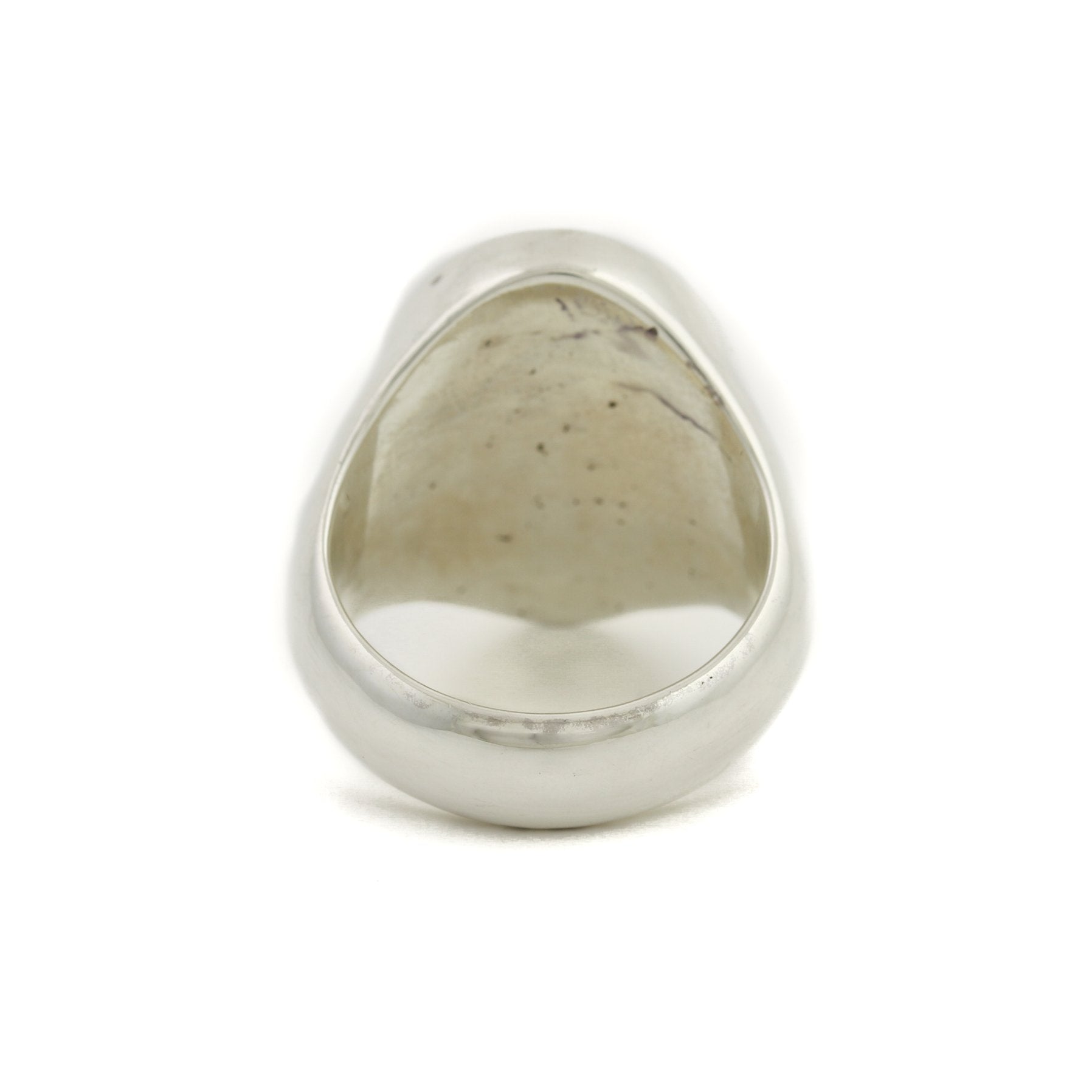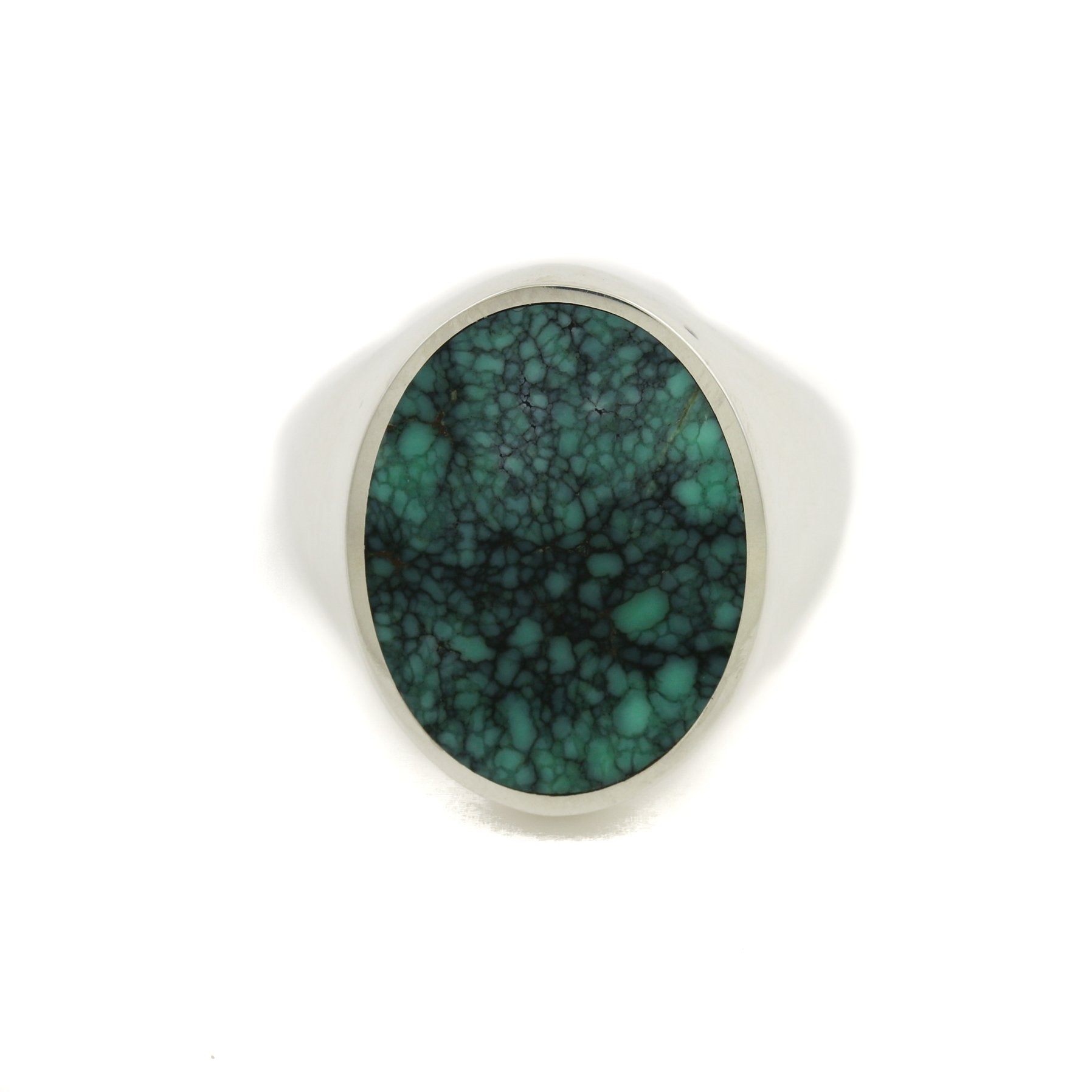This understated beauty is a twist on the classic signet ring. Inlaid with natural Variscite set into a classic oval setting this piece will surely make a fantastic statement. The clean, well thought out, contemporary ring speaks volumes to quality of craftsmanship and design executed in this piece.