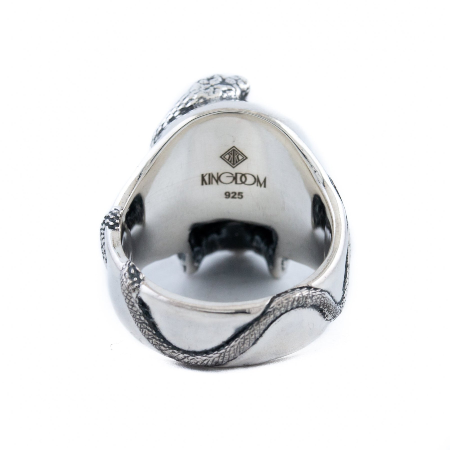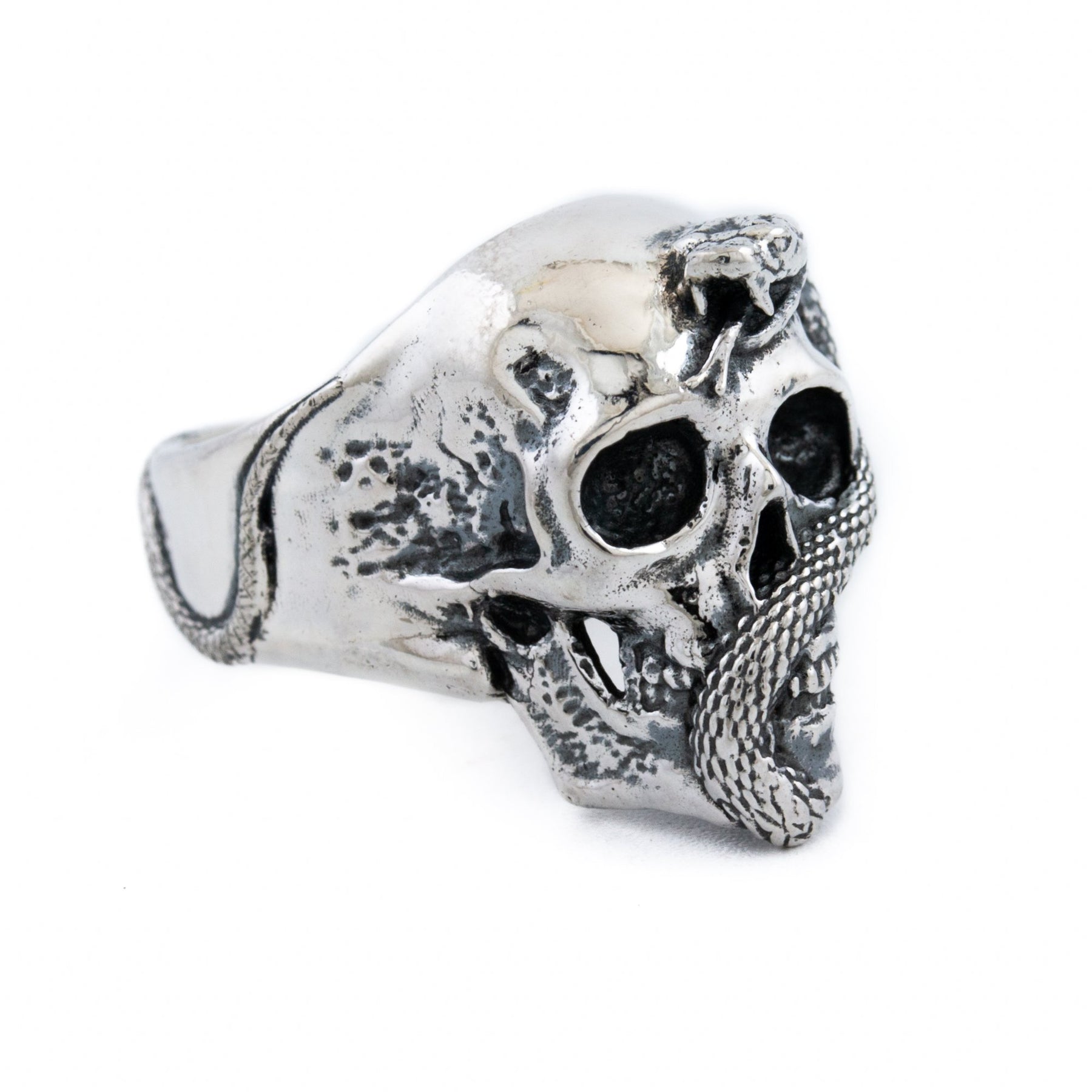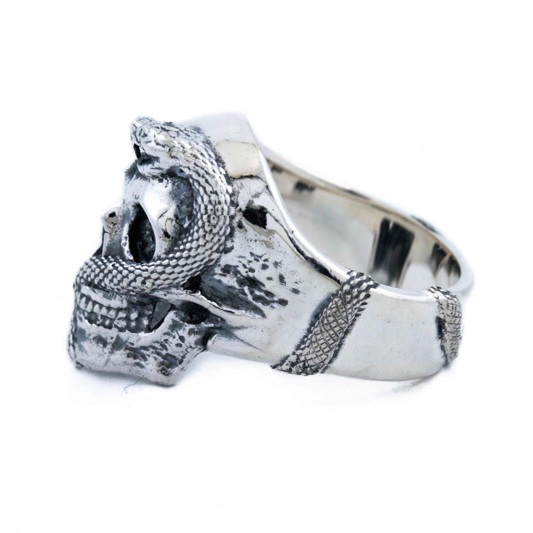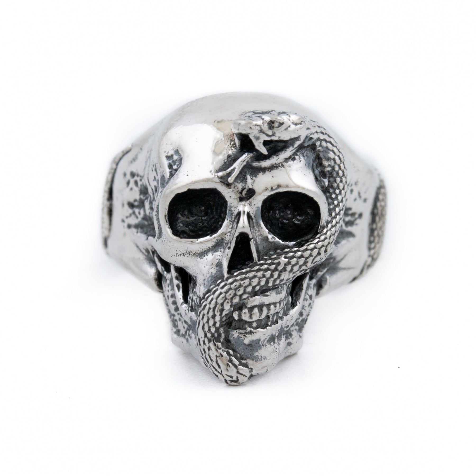 Badass 80's inspired detailed silver skull and snake ring. Whether this bold beauty is added to a fist full of silver or worn on it's own, this ring is made to last!!