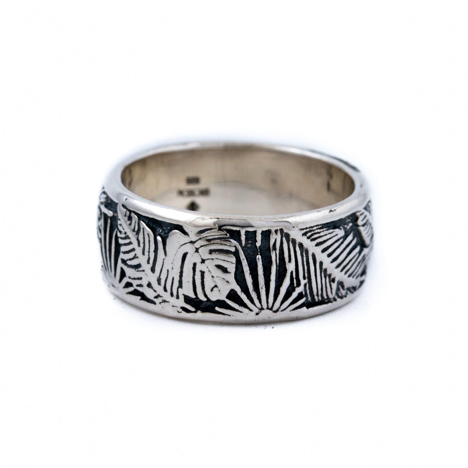 This stackable statement piece features killer high-detail etching and heavy patina silver band ring. Complimented by intricate silver work that depicts jungle plants in a seamless design creating a beautiful and interesting piece. This ring will surely become one of the most treasured within your collection.