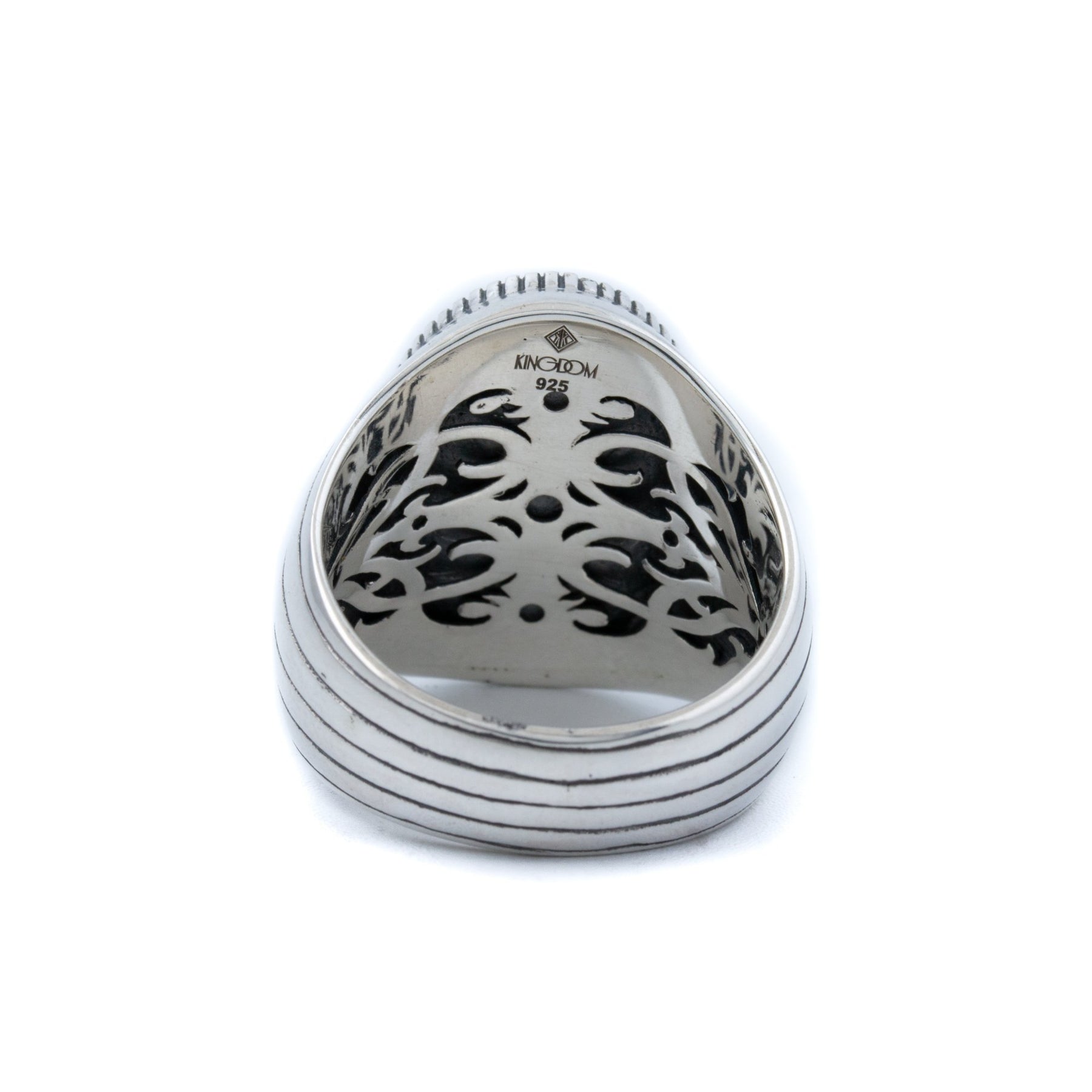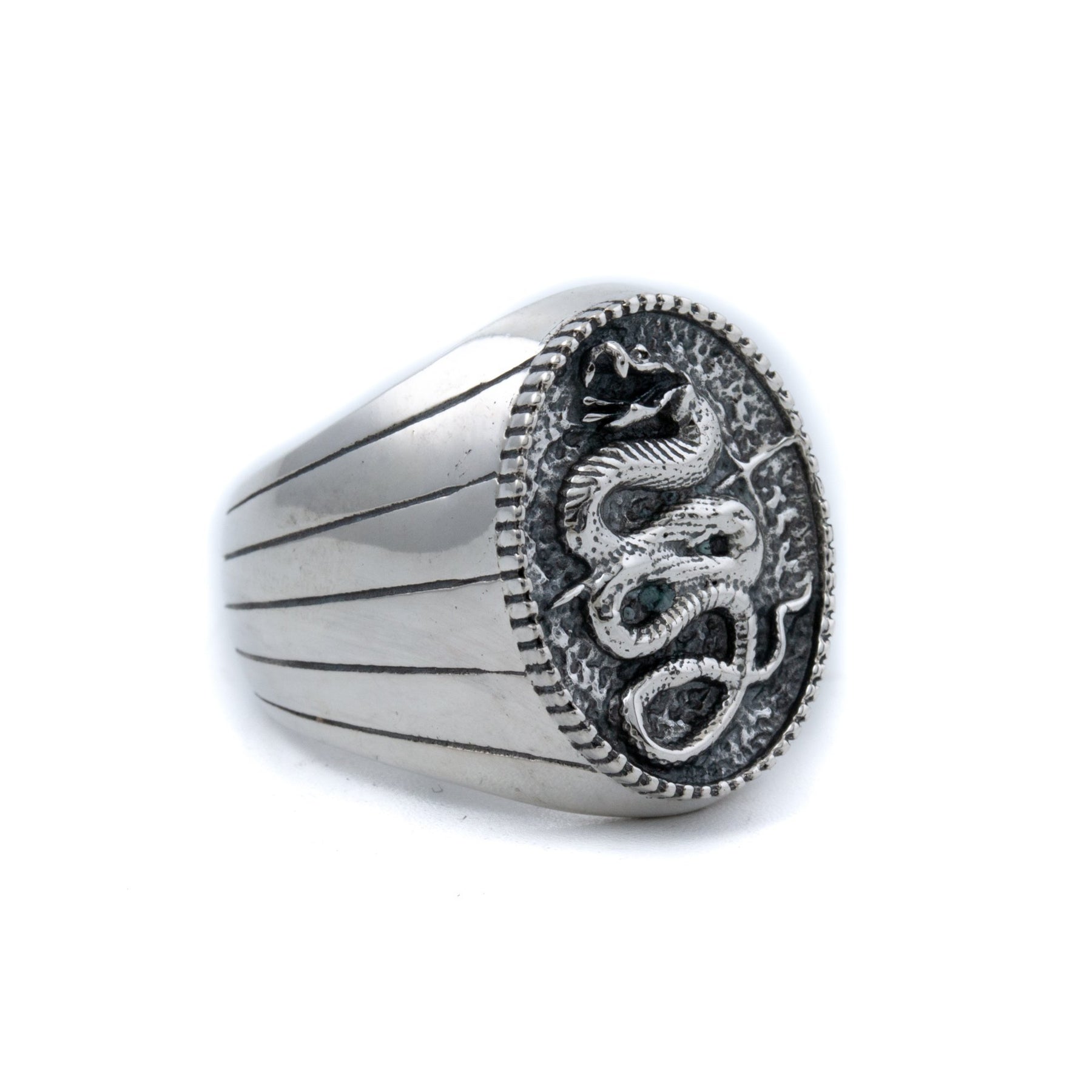 This piece is inspired by vintage 1950's Mexican biker rings. The piece features a cobra in the center and timeless etched marks on either side of the shank. If your looking for an amazing retro looking piece with a some good weight and badass imagery.