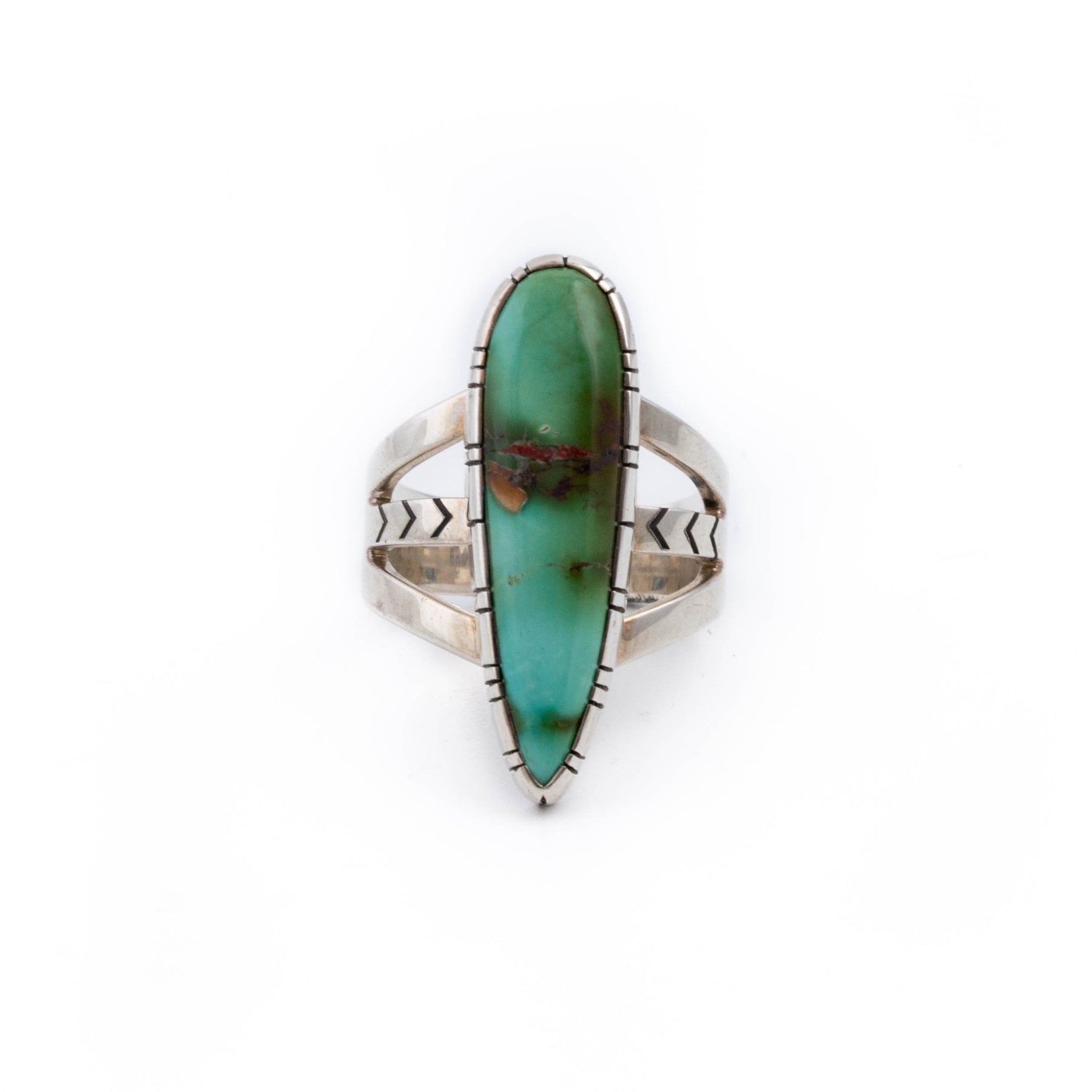 This contemporary teardrop ring is truly something special! The earthy Royston turquoise stone is surrounded by a sterling silver hand cut bezel and split-shank design. A beautiful natural stone that would look killer paired with any of your other favourite jewelry or works perfectly as a stand-alone piece!