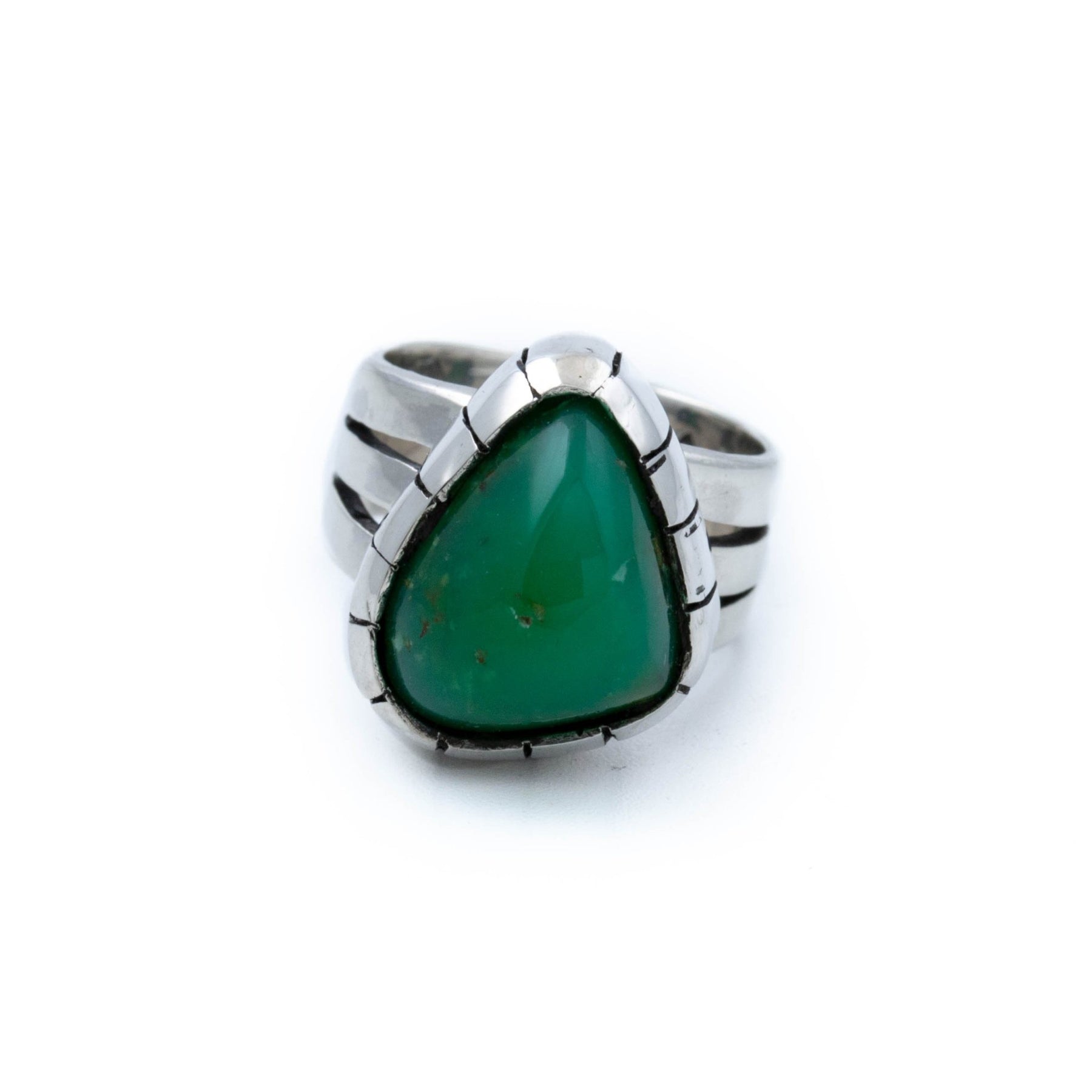 A stunning chrysoprase ring with a beautifully hand-cut bezel. It is said to bring good fortune and prosperity to those who wear it. The gentle, soothing, bright sea green is also said to promote clarity of thought. The simple design makes for a wonderful everyday piece in the collection.
