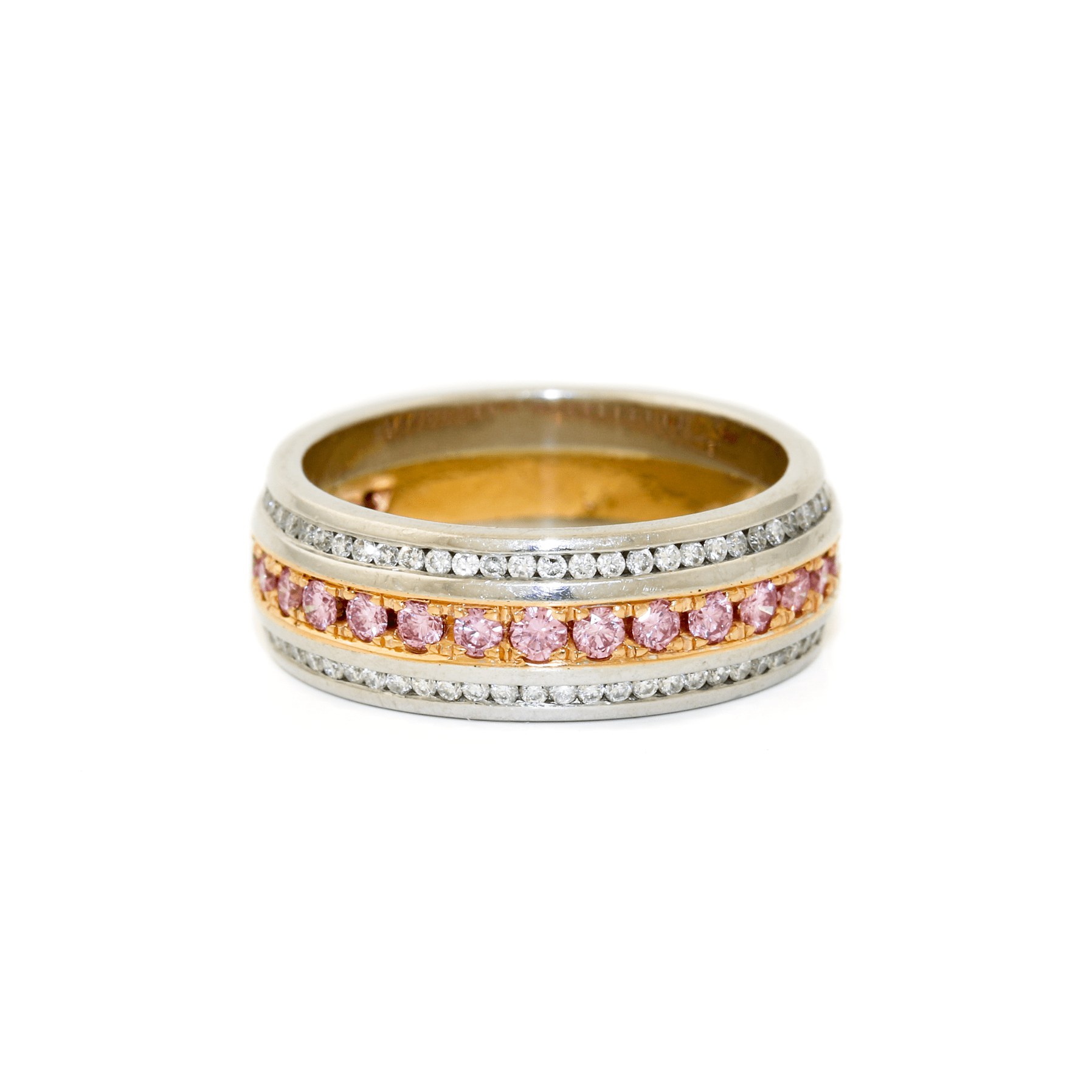 A striking blend of modern elegance and timeless luxury, this exquisite semi-eternity band is crafted in platinum with 18K yellow and rose gold accents. The band is adorned with a stunning row of 0.47ct pink diamonds, set in warm rose gold, adding a unique and vibrant touch. Framing this captivating center, 0.40ct white diamonds are delicately pave-set along the platinum edges, enhancing the brilliance and sophistication of the design.