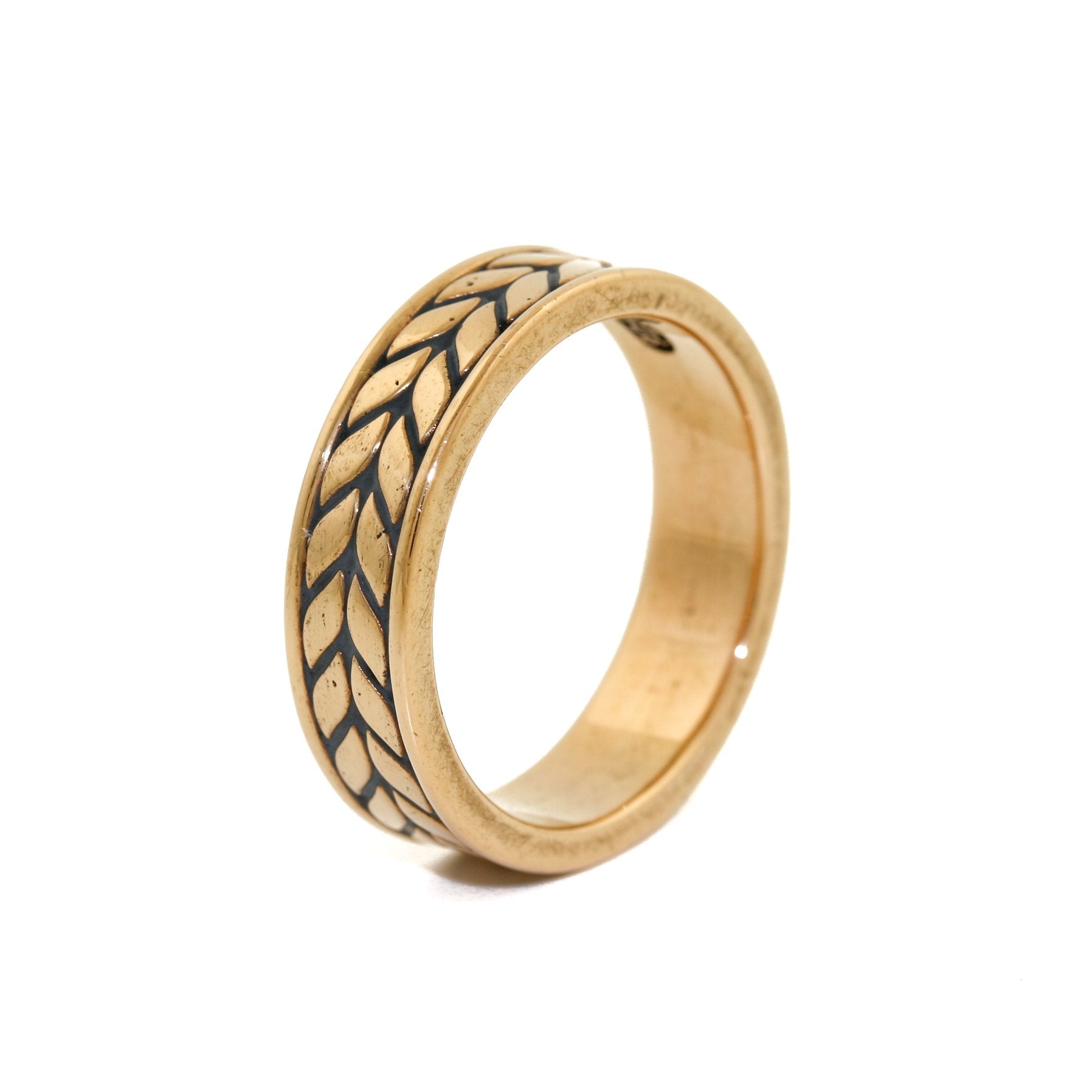 The soft and organic design of this wedding band is textured and depicts a wheat grain motif that surrounds the entirety of the band.