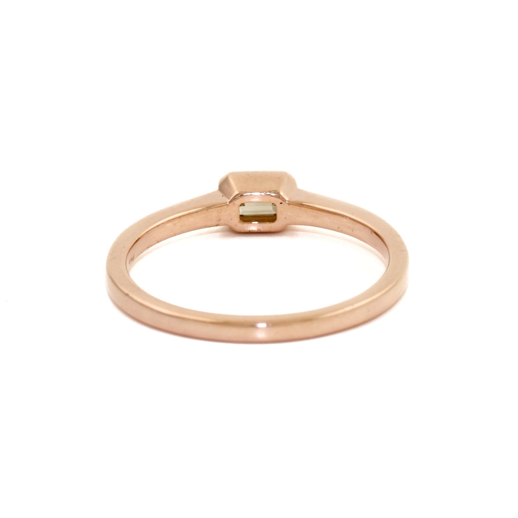 This exquisite ring features an east-west set emerald cut champagne diamond, beautifully showcased in a sleek bezel setting. The unique orientation of the diamond highlights its elongated shape, creating a captivating visual effect that is both modern and chic. The warm, rich tones of the champagne diamond perfectly complement the luxurious 14K rose gold band, adding a touch of romance and sophistication.