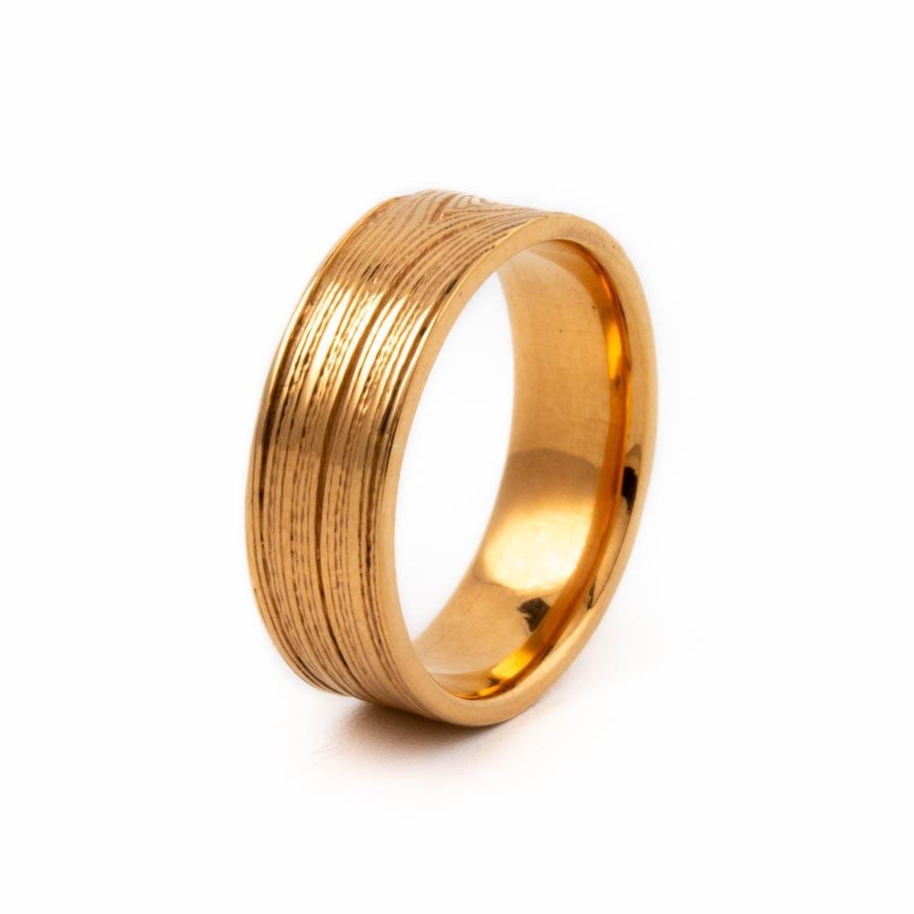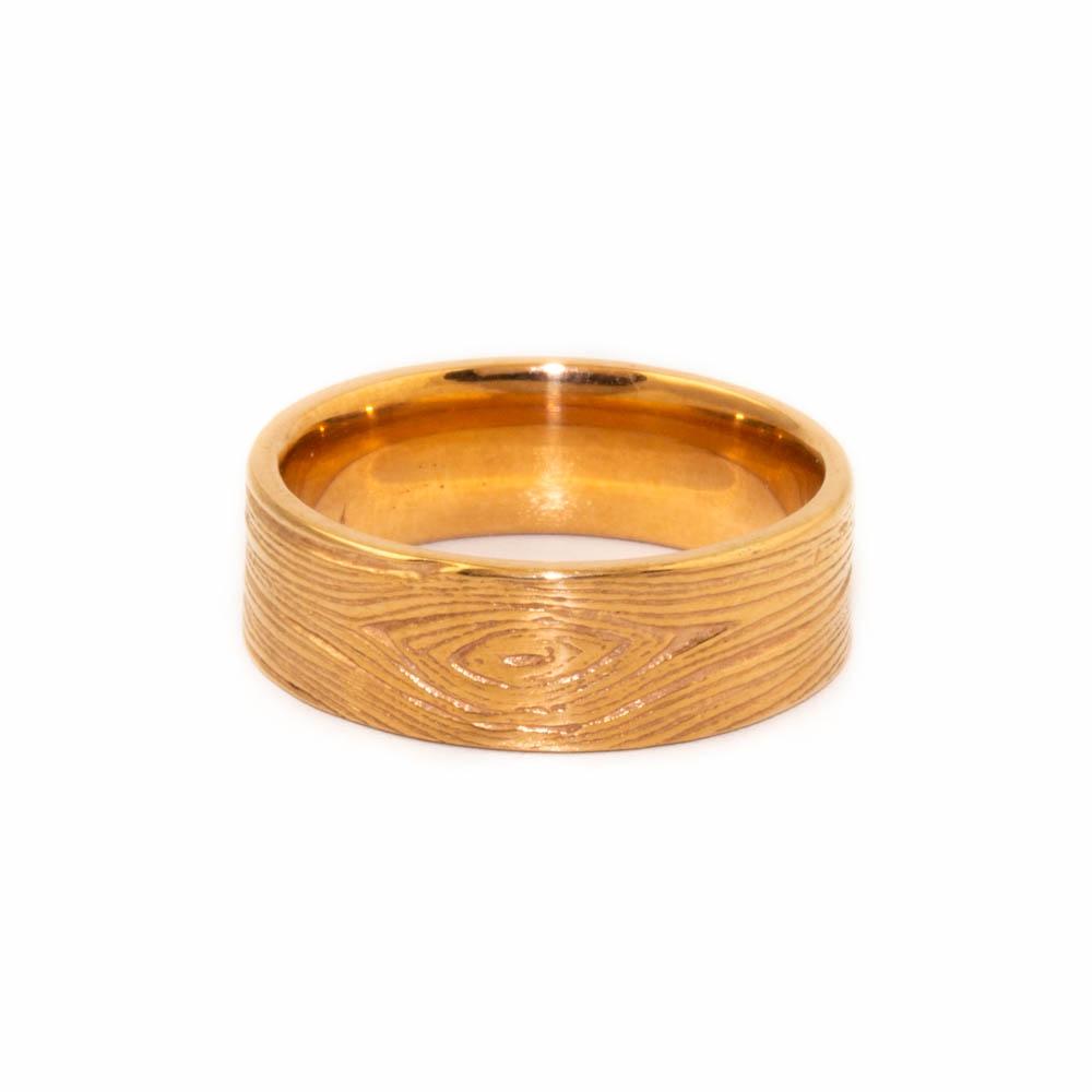 The soft and organic design of this wedding band is textured and depicts woodgrain. This band truly is very comfortable making it a must have everyday staple, working elegantly to make this an interesting heirloom to pass down for years to come.