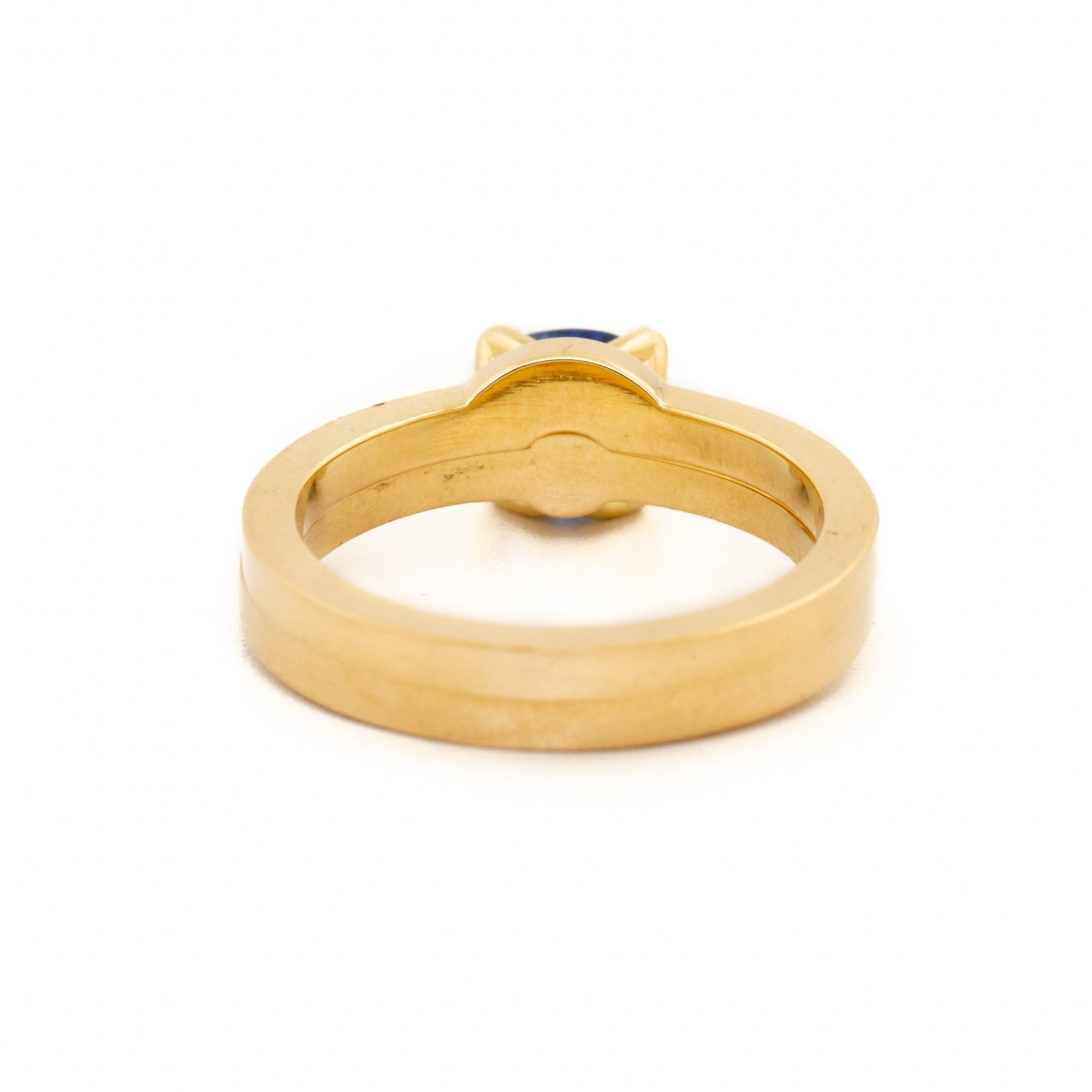 This two ring wedding suite is set in 18 karat yellow gold. The engagement ring has a  blue claw-set Sri Lakan sapphire with micro pave diamonds set along the band. The wedding band snuggles up close to the engagement ring with micro-pave diamonds as well coming together, this set will take your breath away. Incredible contemporary rings that will be keepsakes to pass down for years to come.