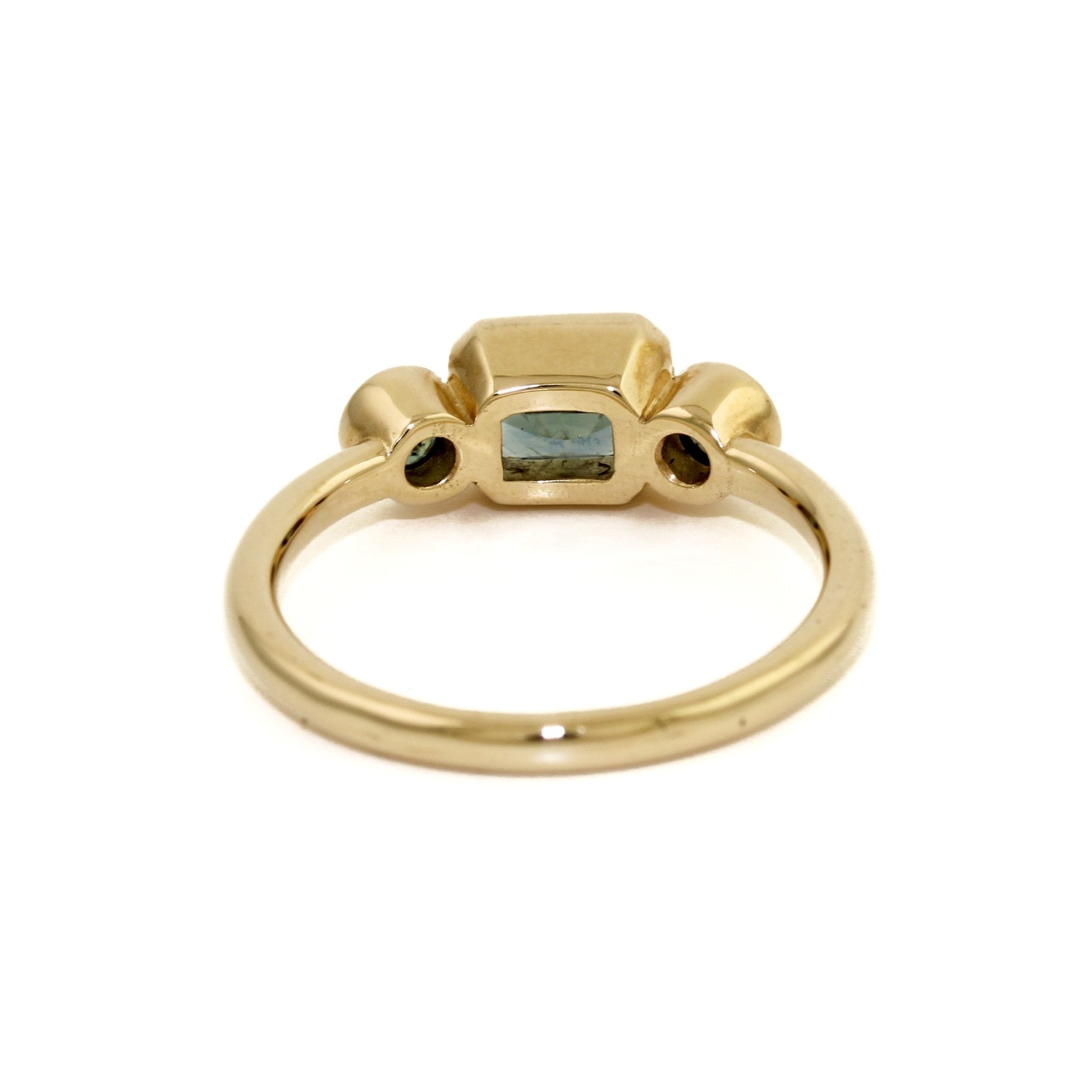 This stunning ring is handmade with art deco flair, featuring a step cut Sapphire center stone with moody  sapphires on each side all set in a 14k setting.