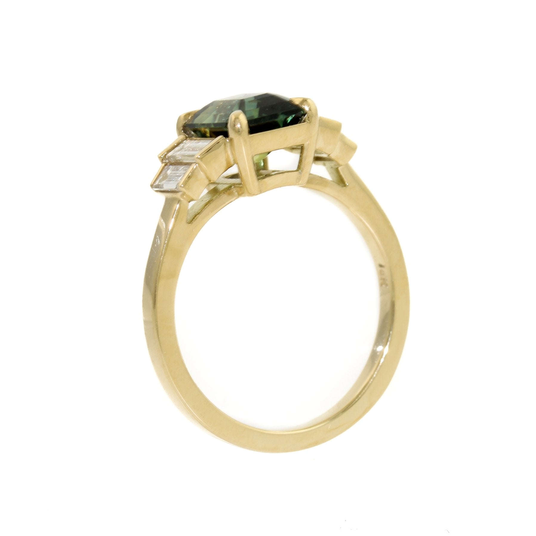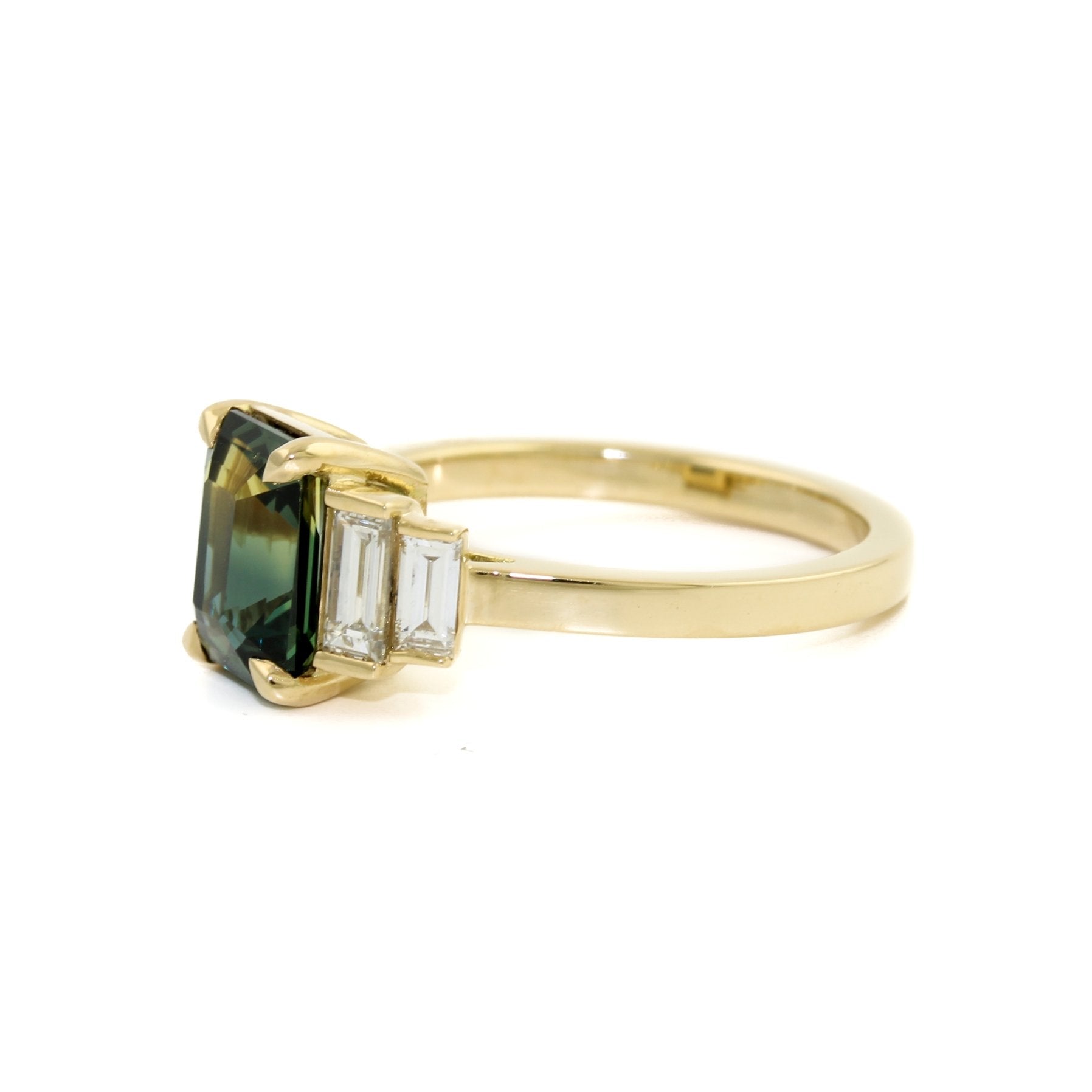 This stunning ring is handmade with an art deco flair, featuring an emerald cut Sapphire center stone with baguette cut diamonds on each side. All set in 18k Gold.