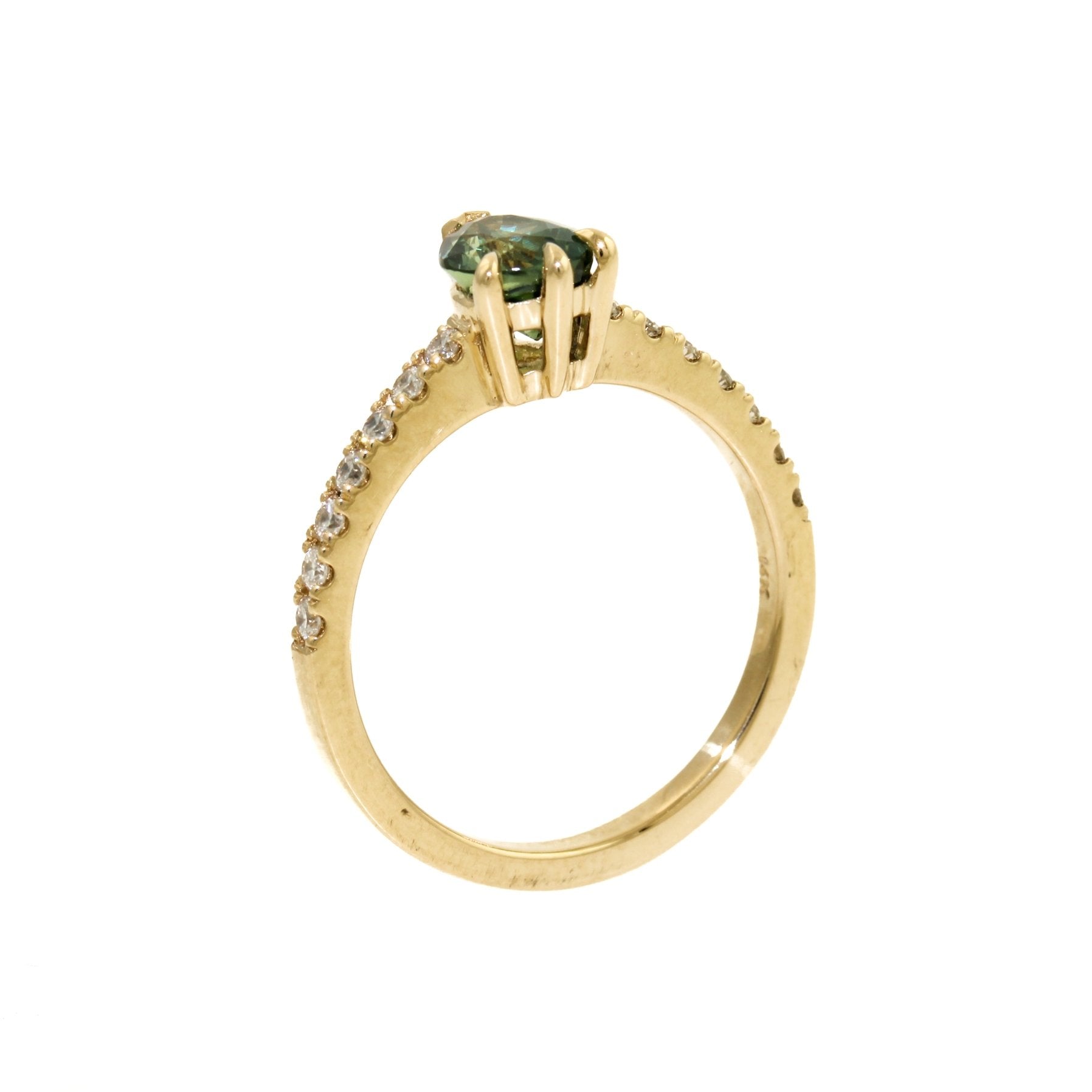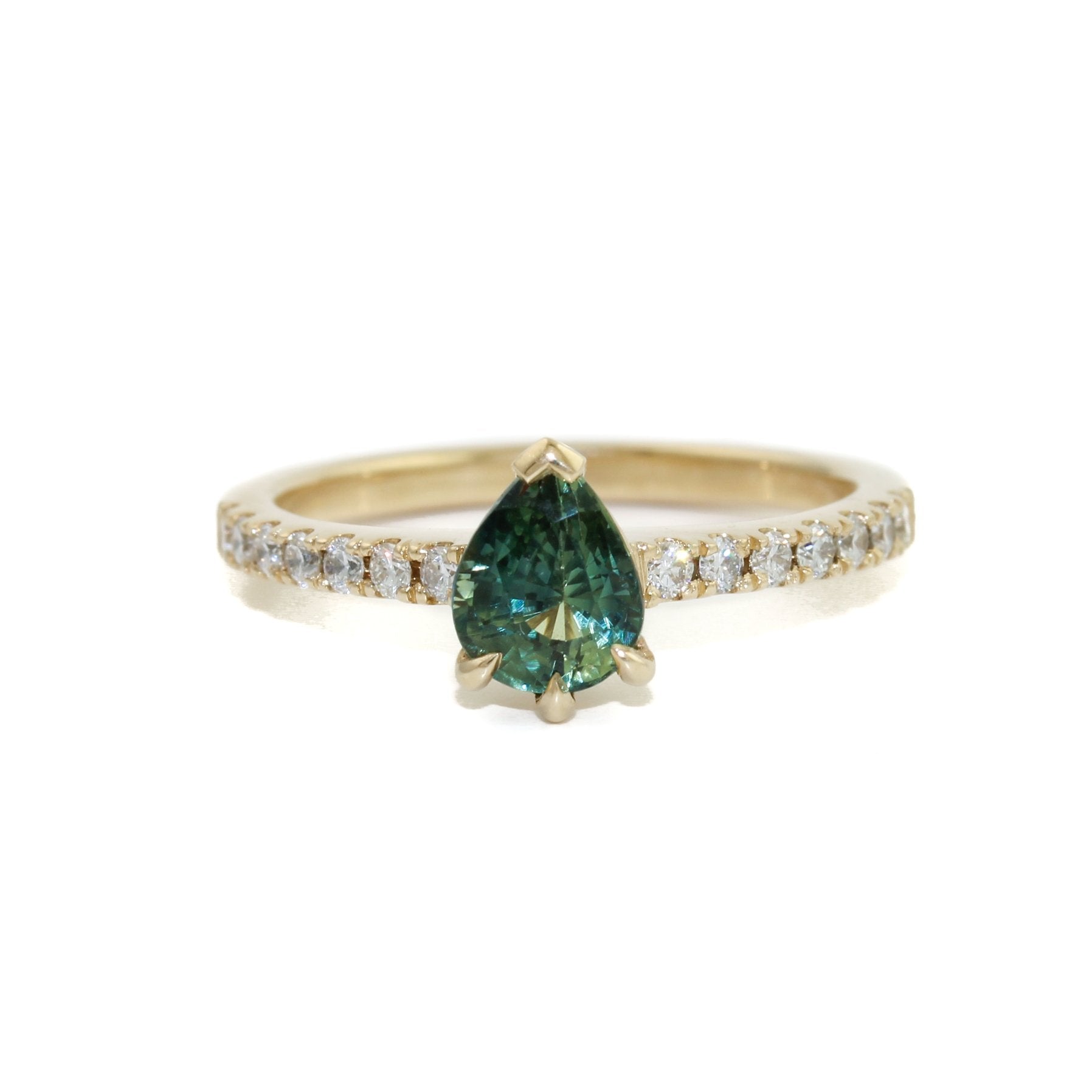 An alluring seafoam green sapphire, cut in the shape of a teardrop to flatter and elongate the finger. This beautiful stone is set in a 14k gold bezel, surrounded by brilliant tiny diamonds. Featuring a claw setting to allow all your attention to focus on this precious sapphire stone. This design is made to last a lifetime and more, with its genuine heirloom quality and craftsmanship.