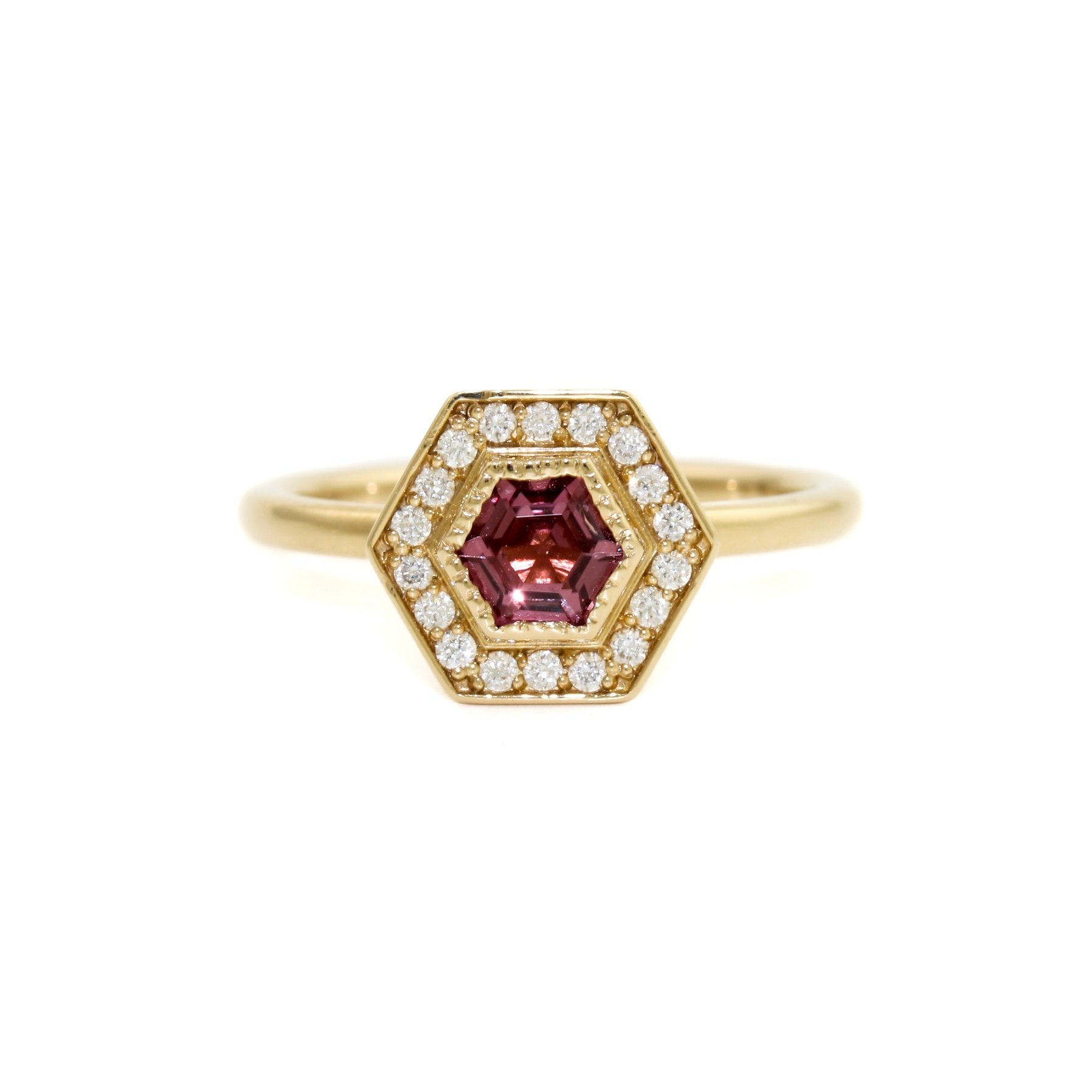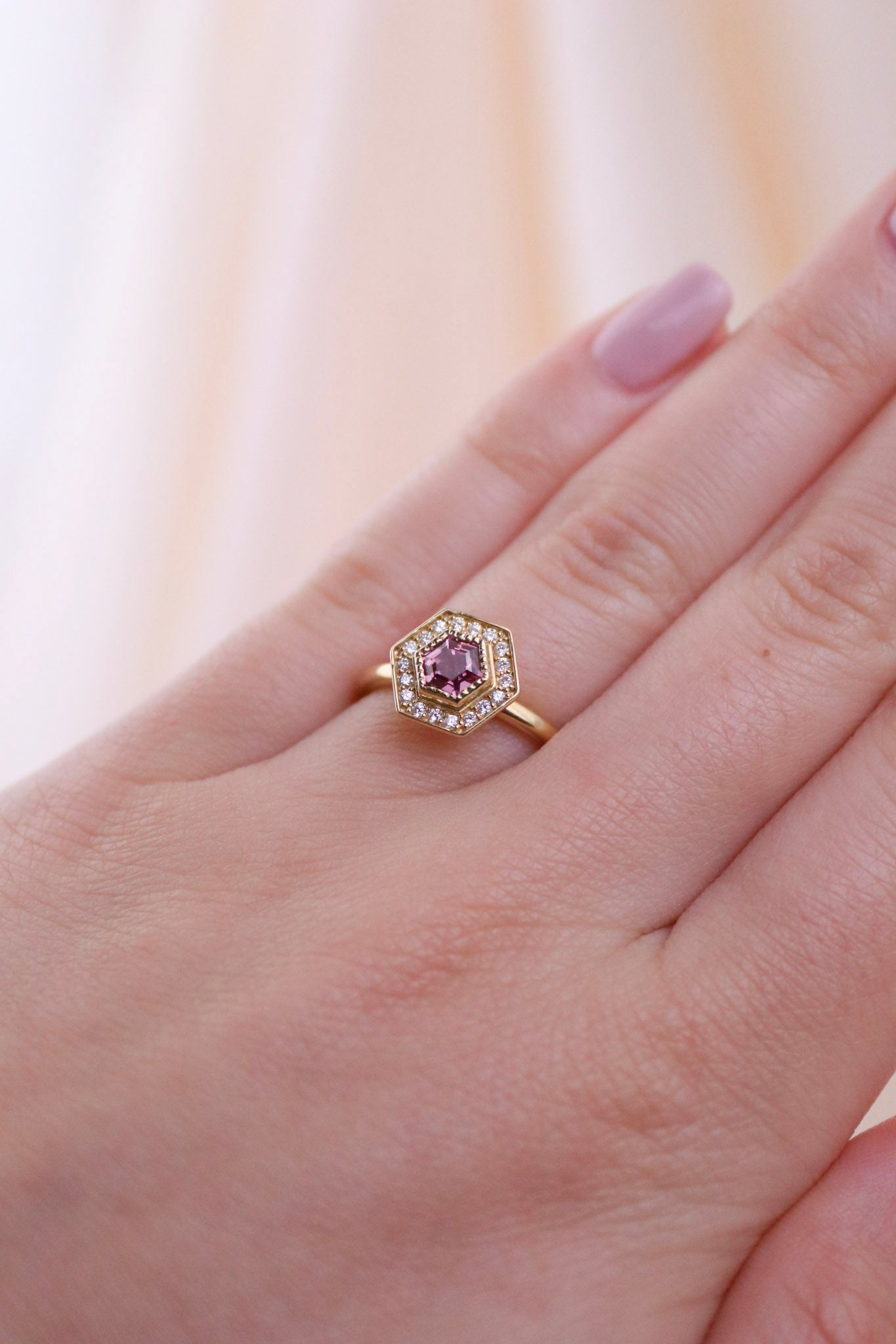 Beautiful alternative engagement gold, sapphire and diamond ring. Set with a halo of diamonds surrounding the hexagon shaped sapphire with a classic solid gold band makes this the perfect special ring for that special someone.