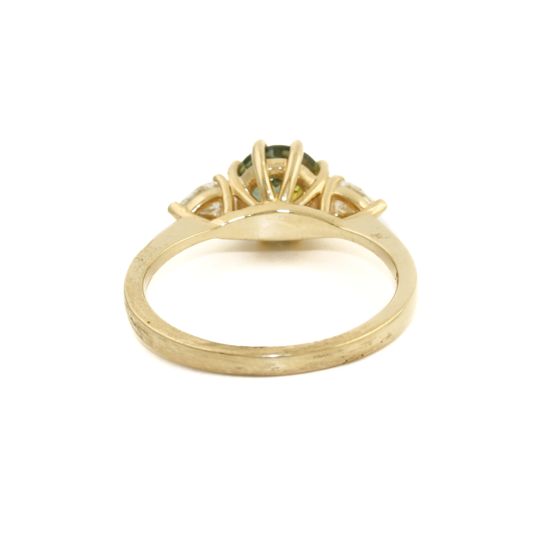 Delve into crystal-clear water with this stunning light blue sapphire, a shimmer of rich orange will catch your eye the longer you gaze into this brilliant stone and in certain lights. Set in a 14-karat yellow gold bezel, the band of this ring tapers into the specimen, emphasizing the Montana Sapphire and its adorning .22-carat white diamonds. Together, the elements of this ring come together in unique matrimony of design and quality to last you a lifetime.