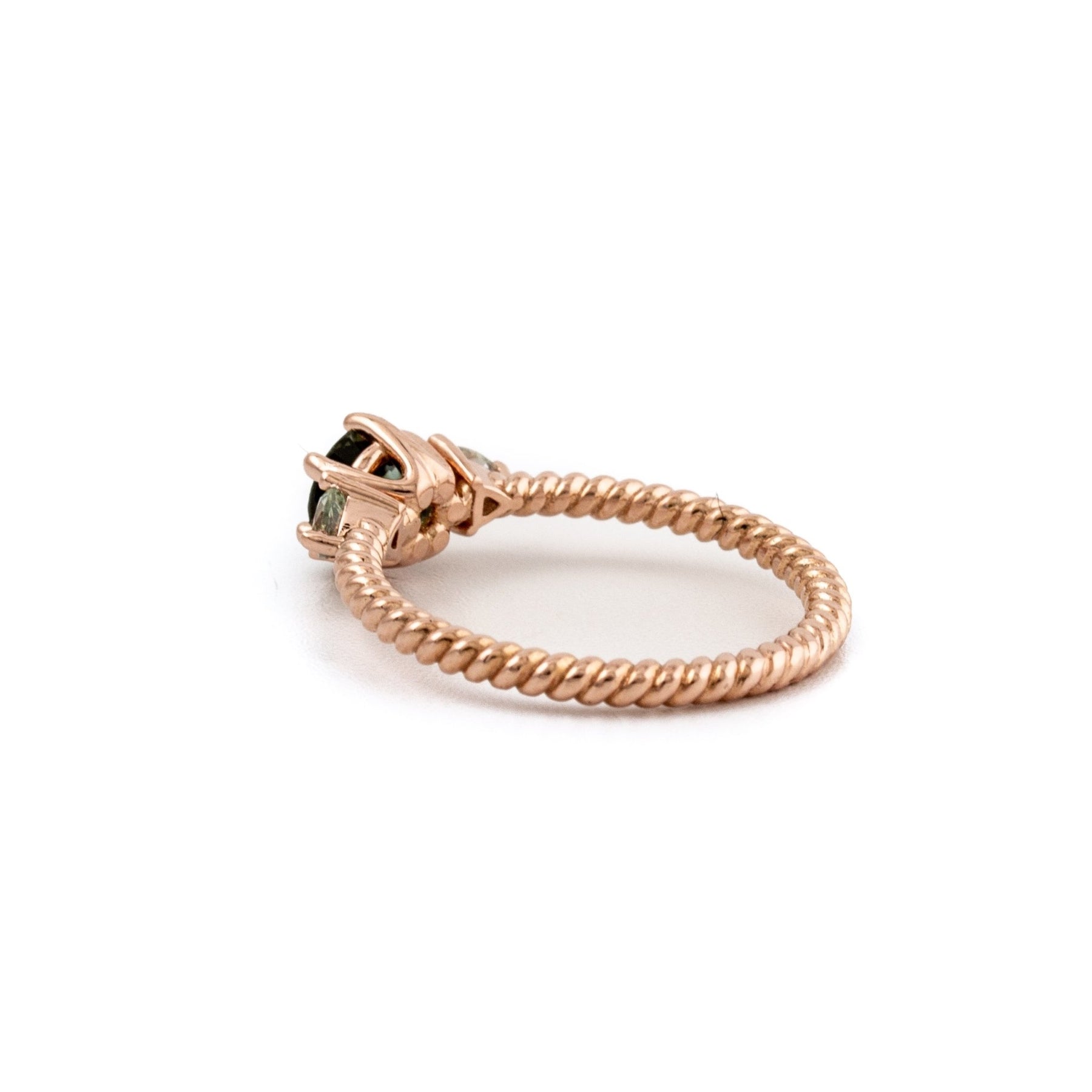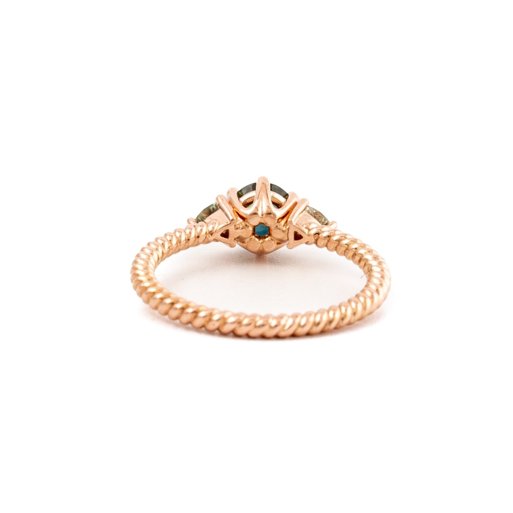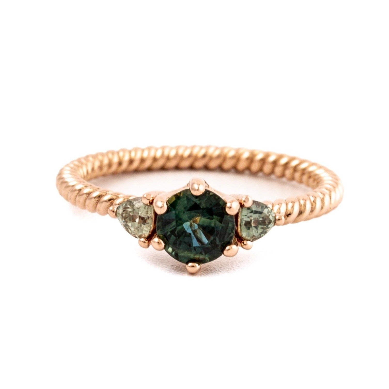Stunning horizontal sapphire ring. The centre stone features an Australian sapphire with moody teal-blue hues and two side trillion cut sapphires that are more pastel in tone. All of the stones are ethically sourced along with recycled 14k rose gold used for the shank. The twist rope design of the shank adds sophisticated texture to an already classy ring. This is a wonderful piece that will surely stand the test of time and become a coveted heirloom.
