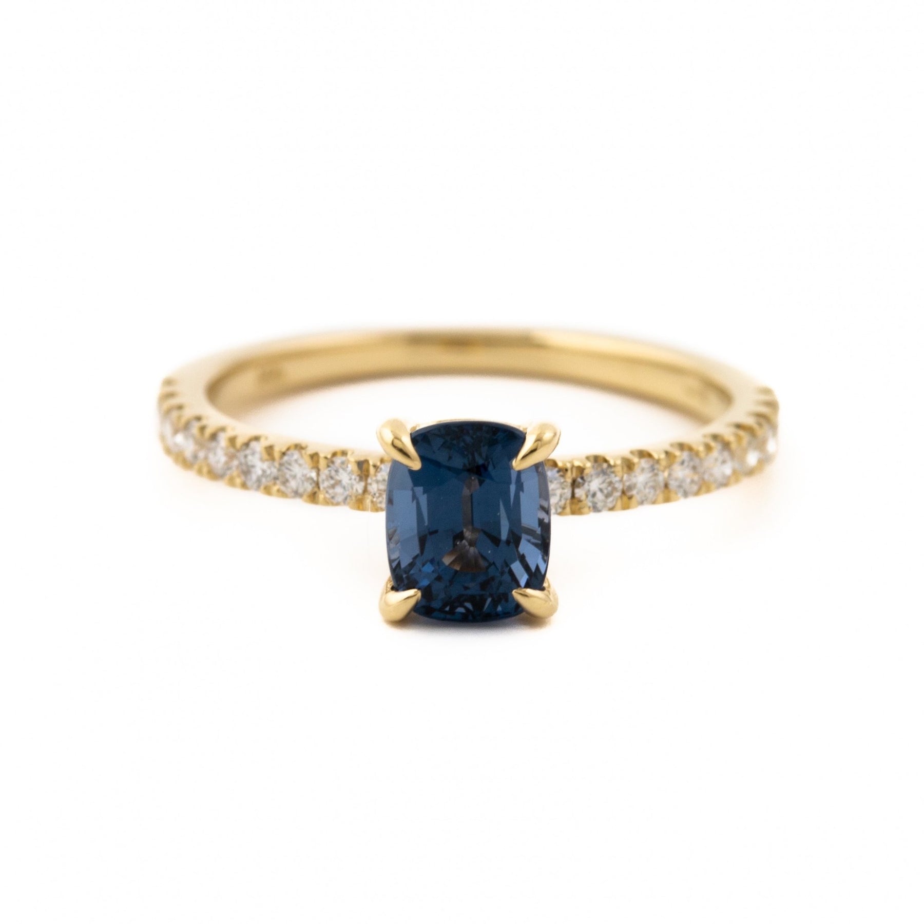 Handmade by Kingdom Fine Jewelry 0.70 ct cushion cut Sri Lankan Sapphire, 0.28 ct white diamonds micropave and 14 karat Yellow Gold.