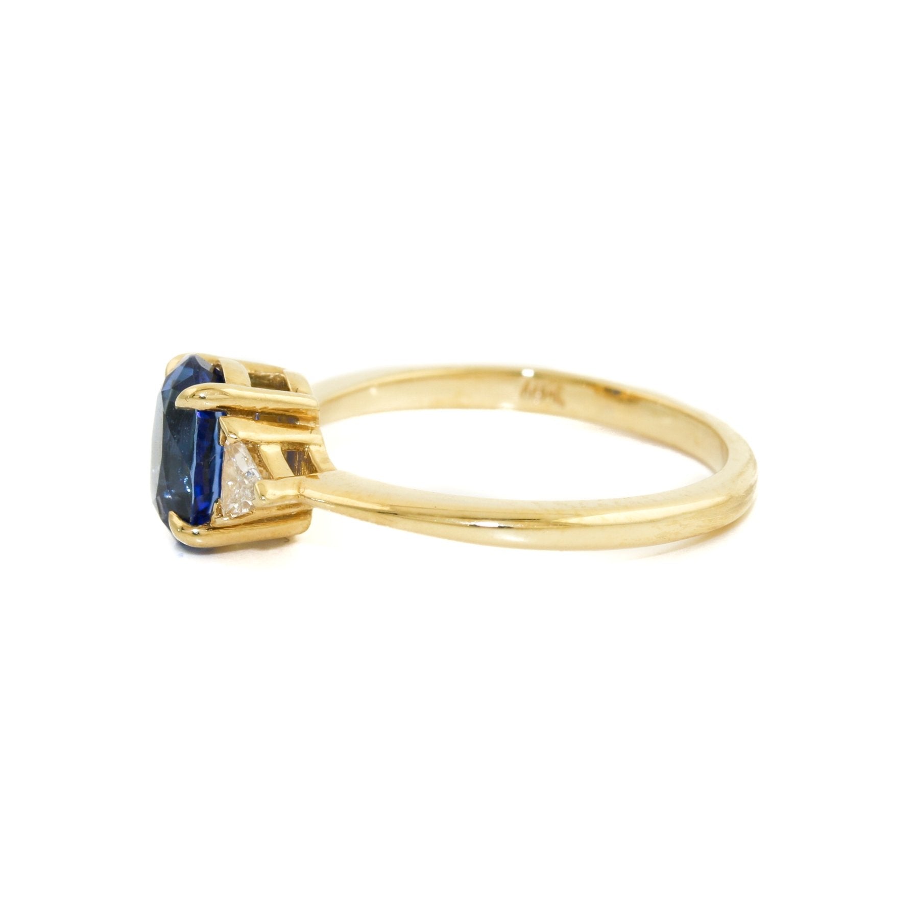 Introducing our breathtaking royal blue Montana sapphire ring with triangle cut diamonds set in 18k gold, a true masterpiece of beauty, luxury and elegance.