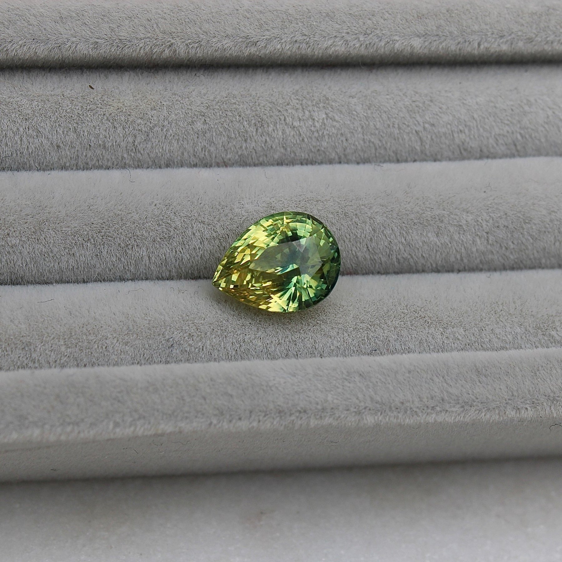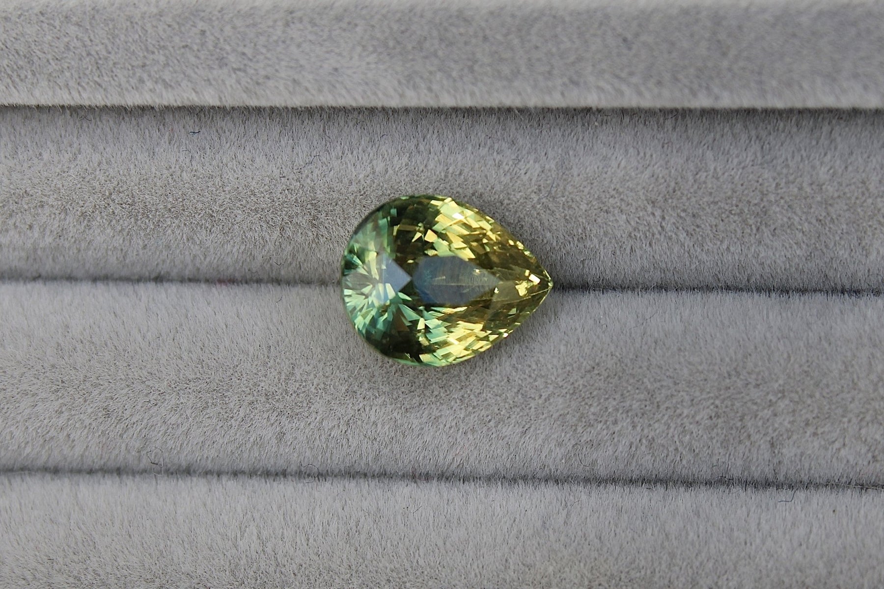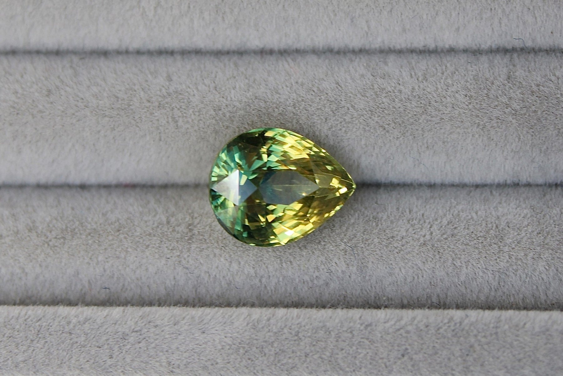 Create the ring of your dreams with this 3.75ct pear-shaped Parti sapphire. This utterly stunning gemstone catches sunny champagne and brilliant fern green tones within its facets, making it a truly one-of-a-kind gemstone.