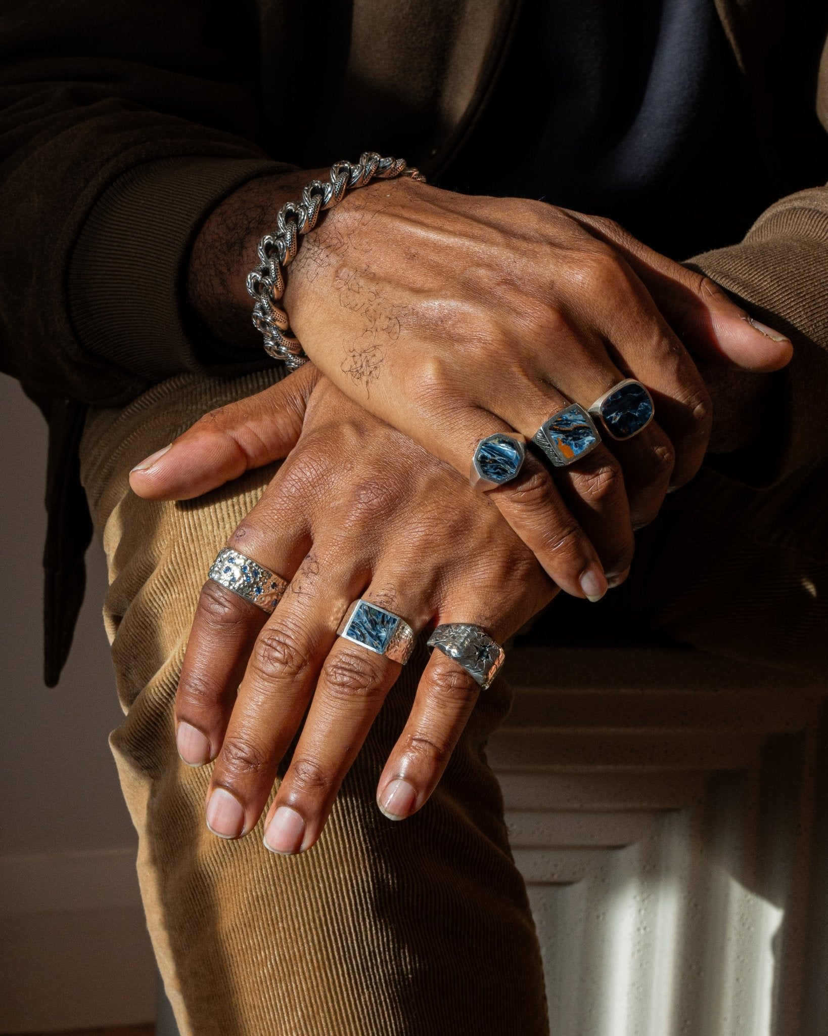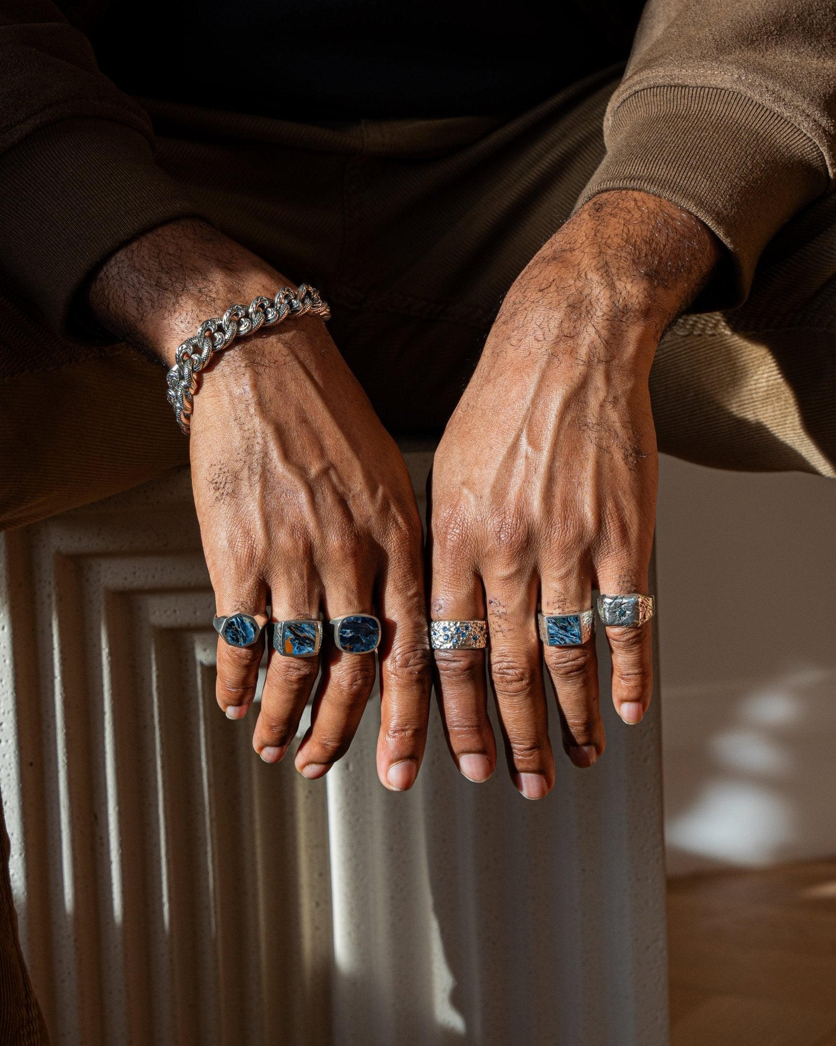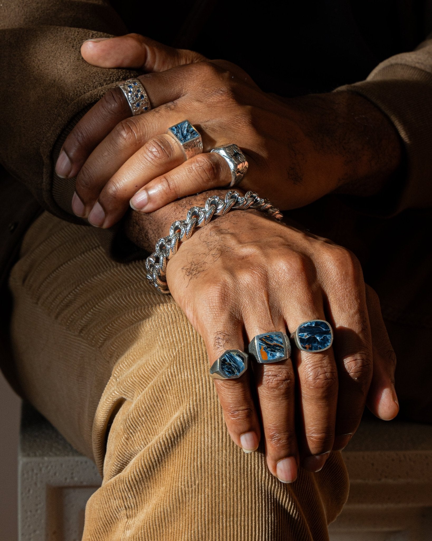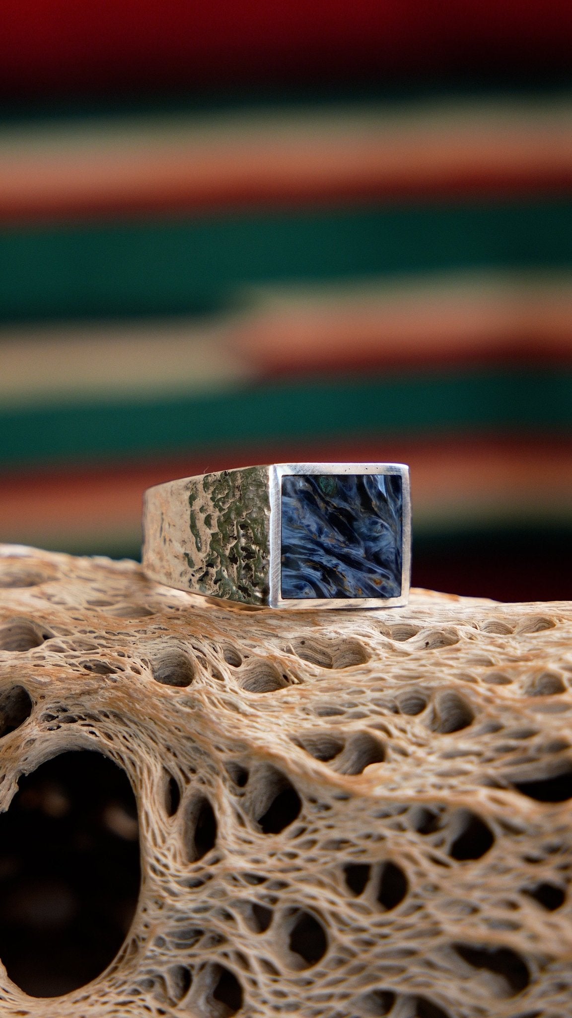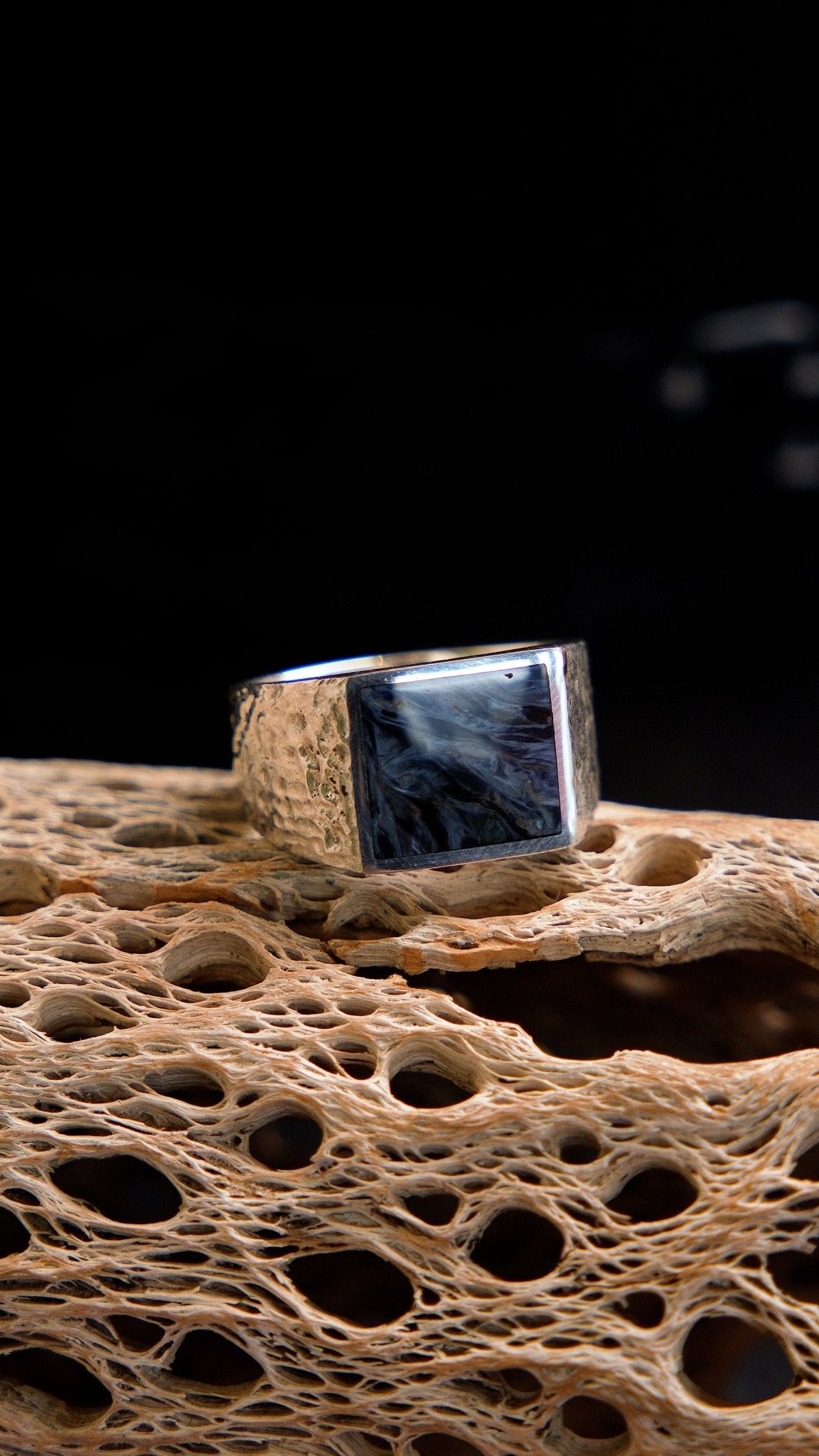 Mens Hammered Silver x Rectangular Pietersite Inlay Ring