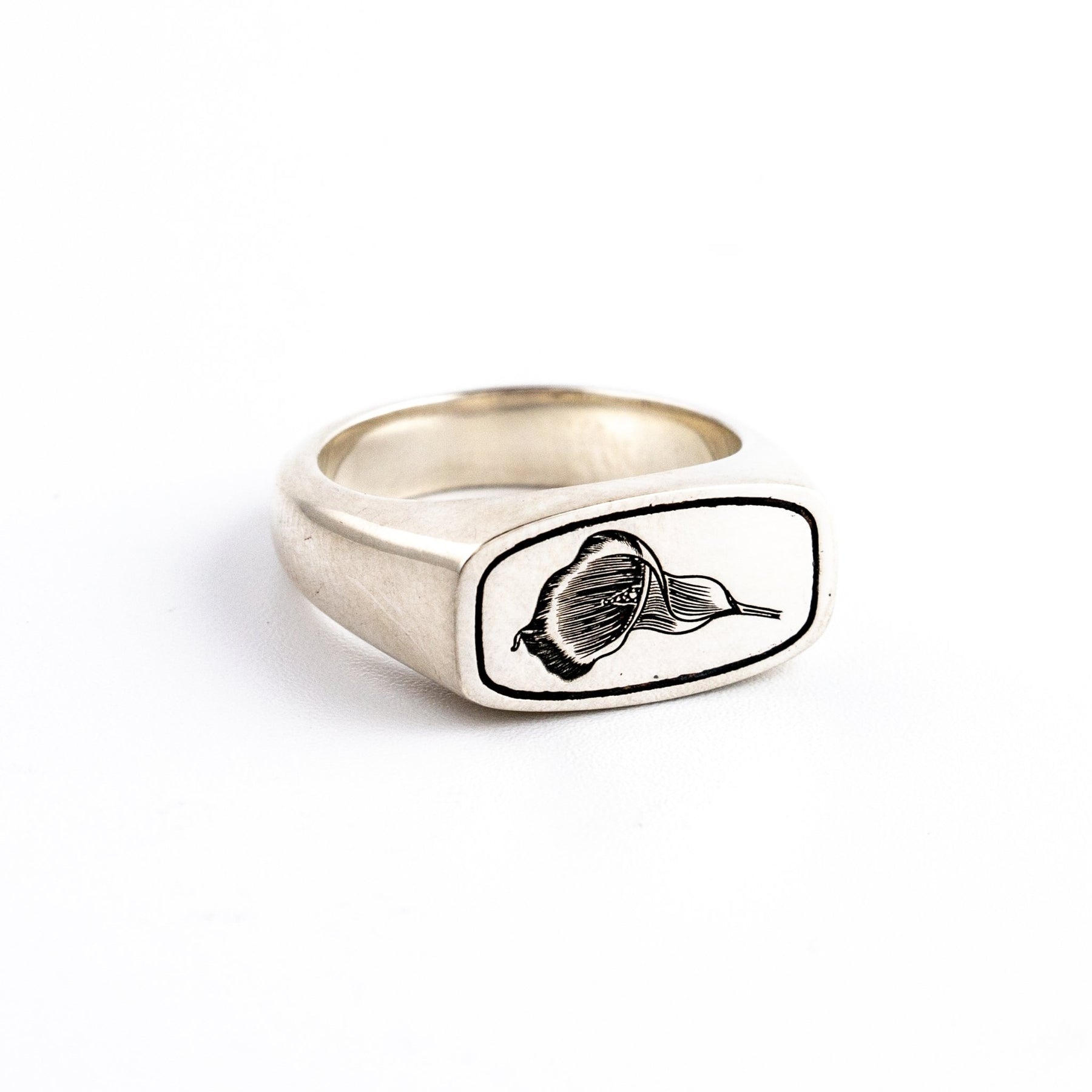 Beautiful sterling silver flower signet ring made by Kingdom. This ring features a laser detailed floral design of an Egyptian Calla Lily. An interesting and unique ring to add to an already existing stack but defiantly cool to wear by itself.