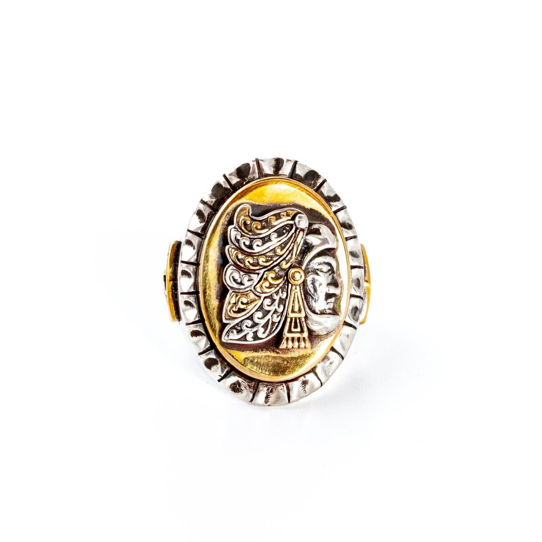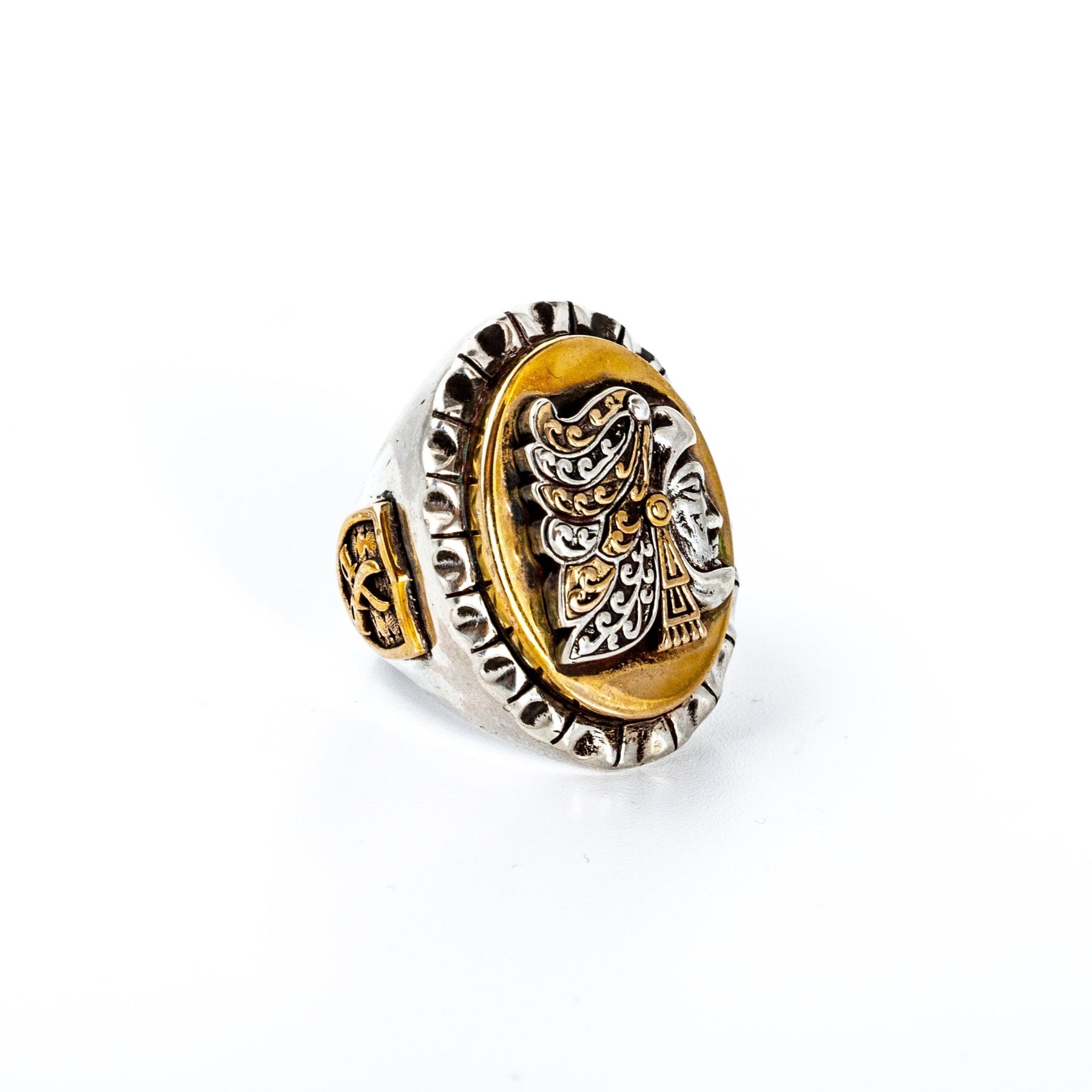 The "Cuau" is a statement piece of nobility and respect to the knights of ancient Aztec civilization. This ring features a highly detailed signet icon of an Aztec Eagle warrior, who were a special class of infantry soldier in the Aztec army, framed in bronze plate and set as the ring's center piece for an almost futuristic and modern design. Just off construction alone, this is definitely a treasure to be coveted.
