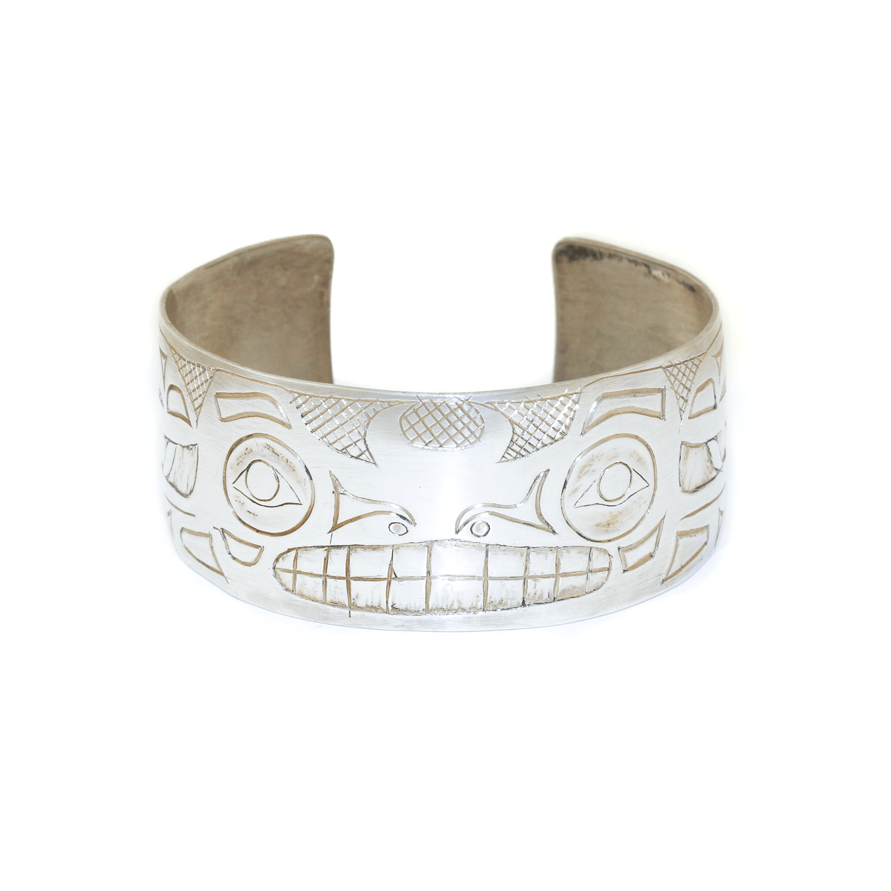 Vintage sterling silver cuff bracelet featuring traditional Pacific Northwest Coast design elements, depicting a stylized bear motif. Expertly hand-engraved with bold, symmetrical lines and textured detailing, the piece reflects the region’s distinctive artistic heritage.