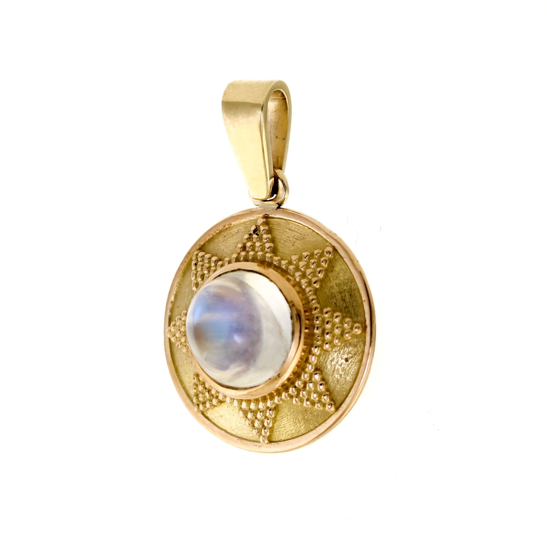 Incredible Rainbow Moonstone and 18 karat gold pendant. This stunner is truly something to swoon over, mother natures finest! The beautiful natural Rainbow Moonstone have a fantastic flash of peach, green and blue. The gold setting has delicately detailed granulation pattern around the stone. Something to be cherished for a lifetime.