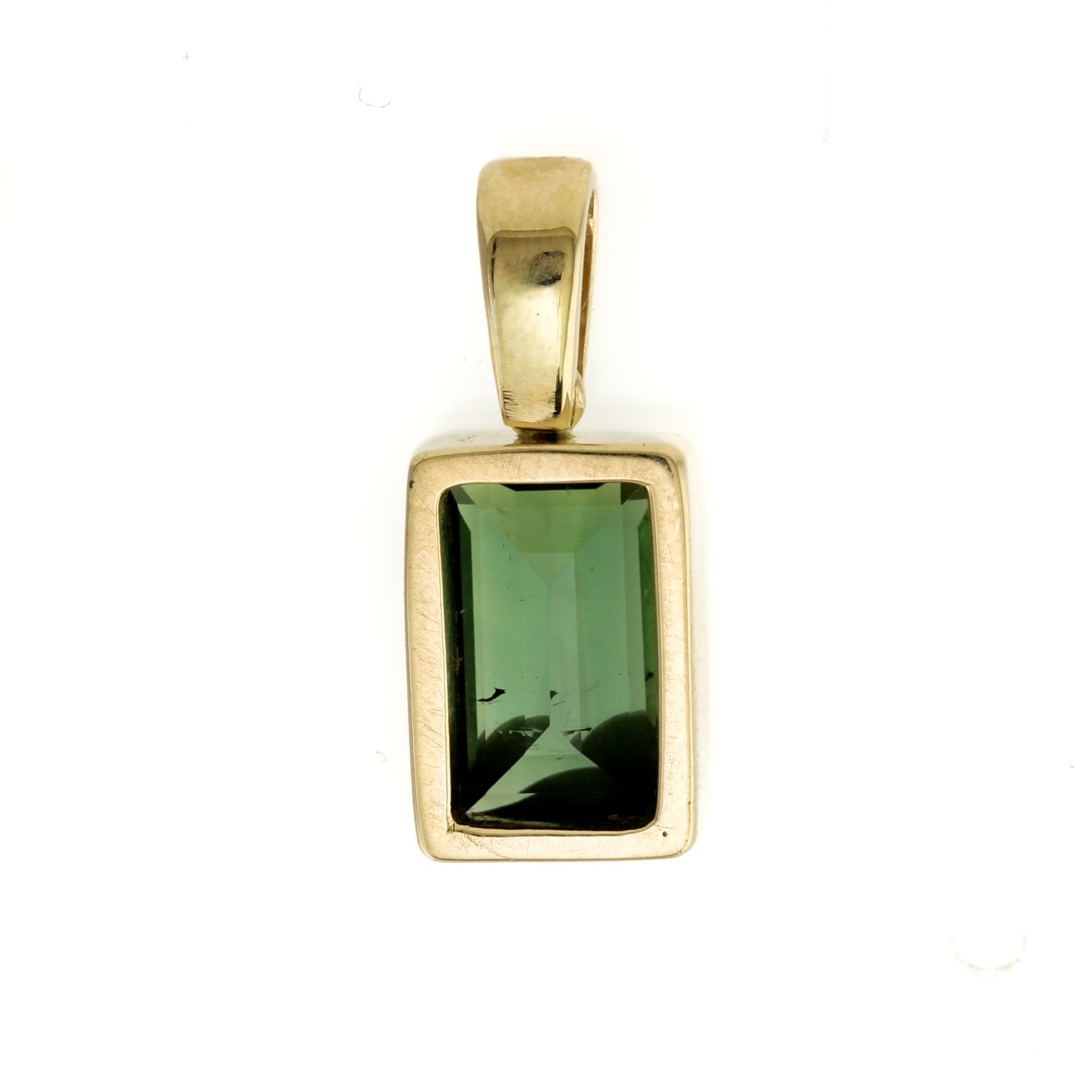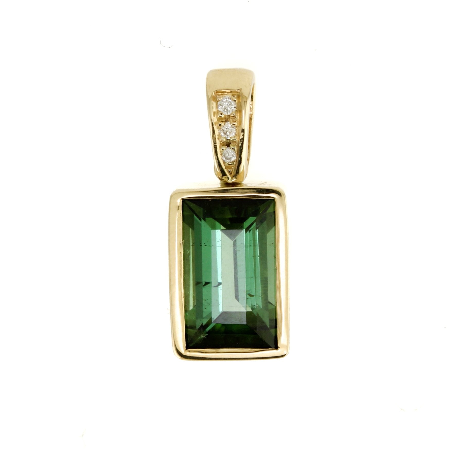 A beautifully crafted pendant featuring an emerald-cut green tourmaline. The bail is adorned with white diamonds. A piece that is timeless and focuses on the natural beauty of the stone.