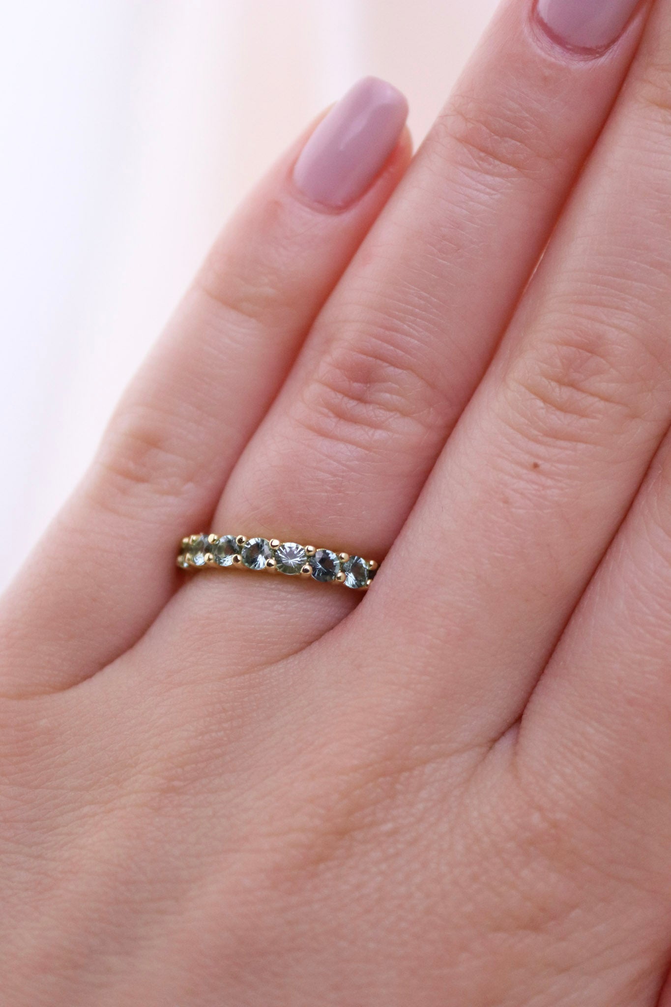 A beautiful stackable band featuring green tourmaline, held by prong bezels and cast in 14k gold.
