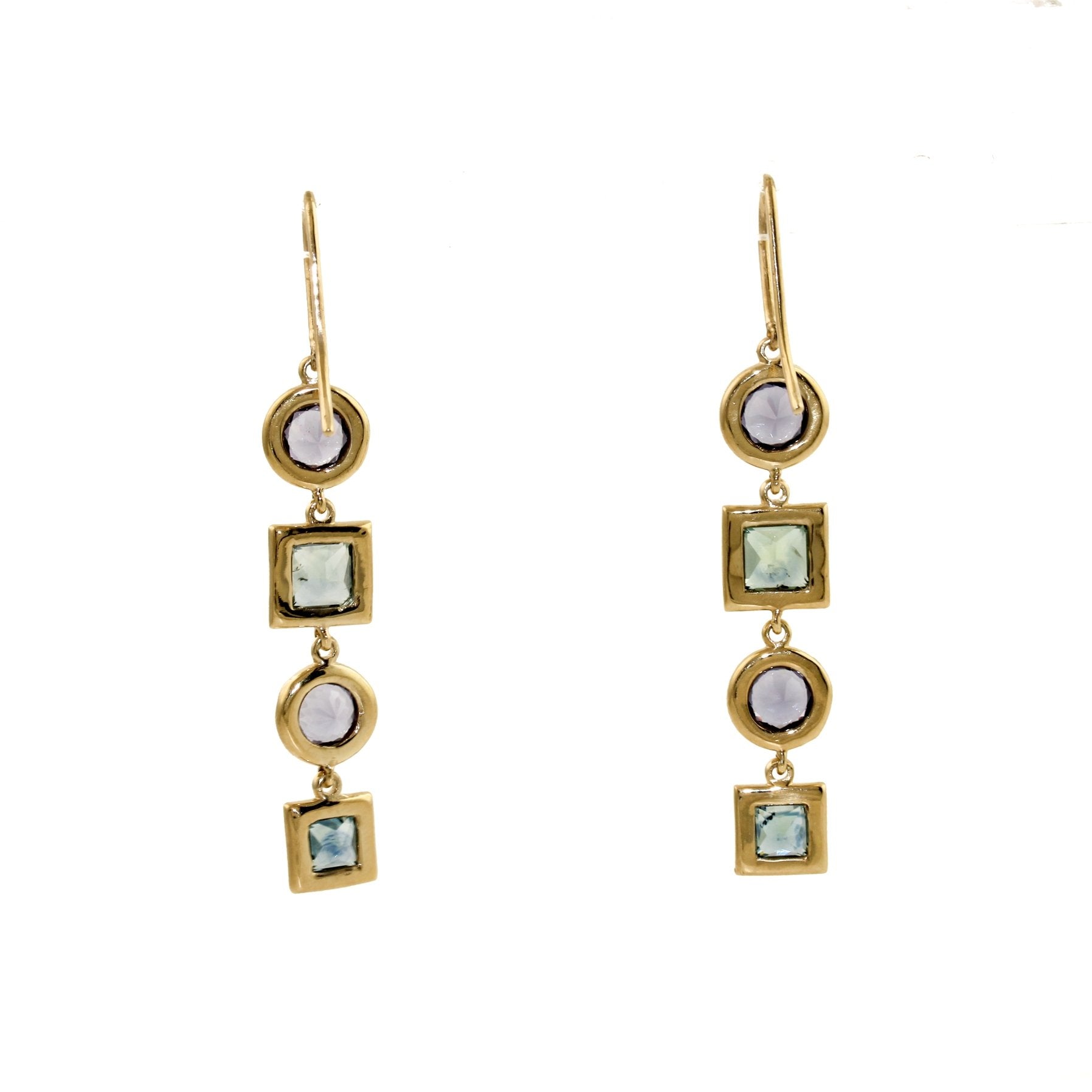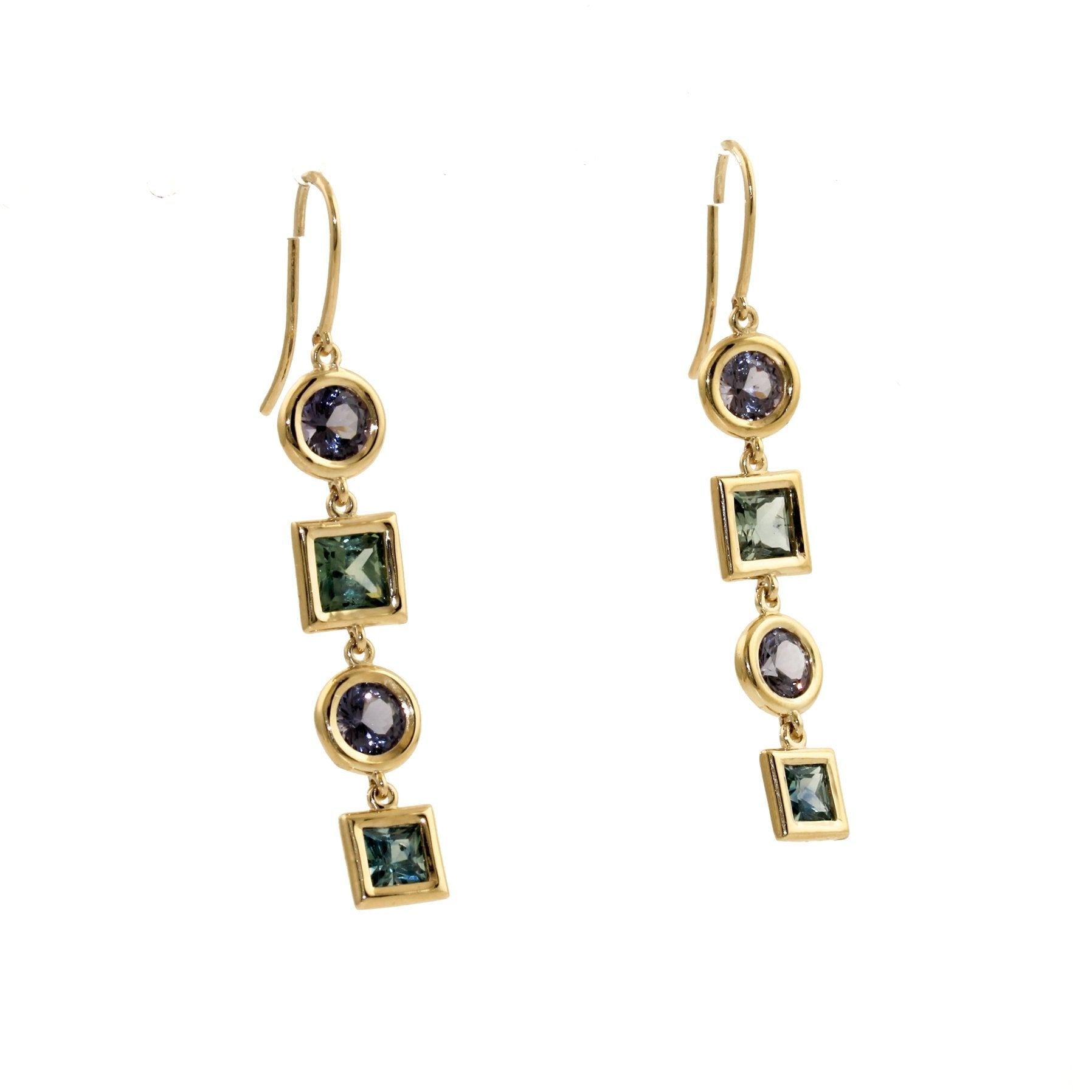 These stunning drop earrings feature Montana Sapphires in an array of tones; purple, gray and green bezeled in 14k yellow Gold. Sapphires are one of the most precious gemstones making this set a fantastic edition to your fine jewelry collection.