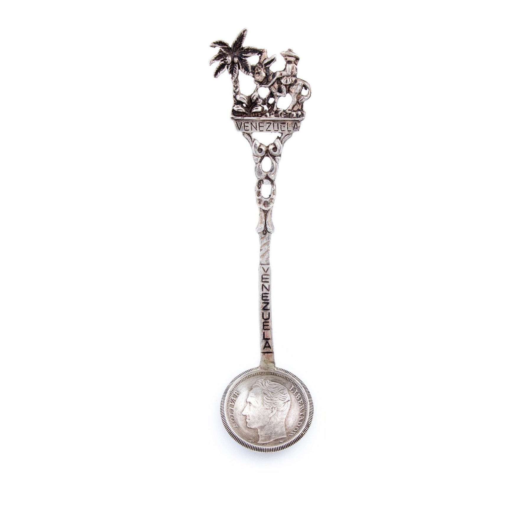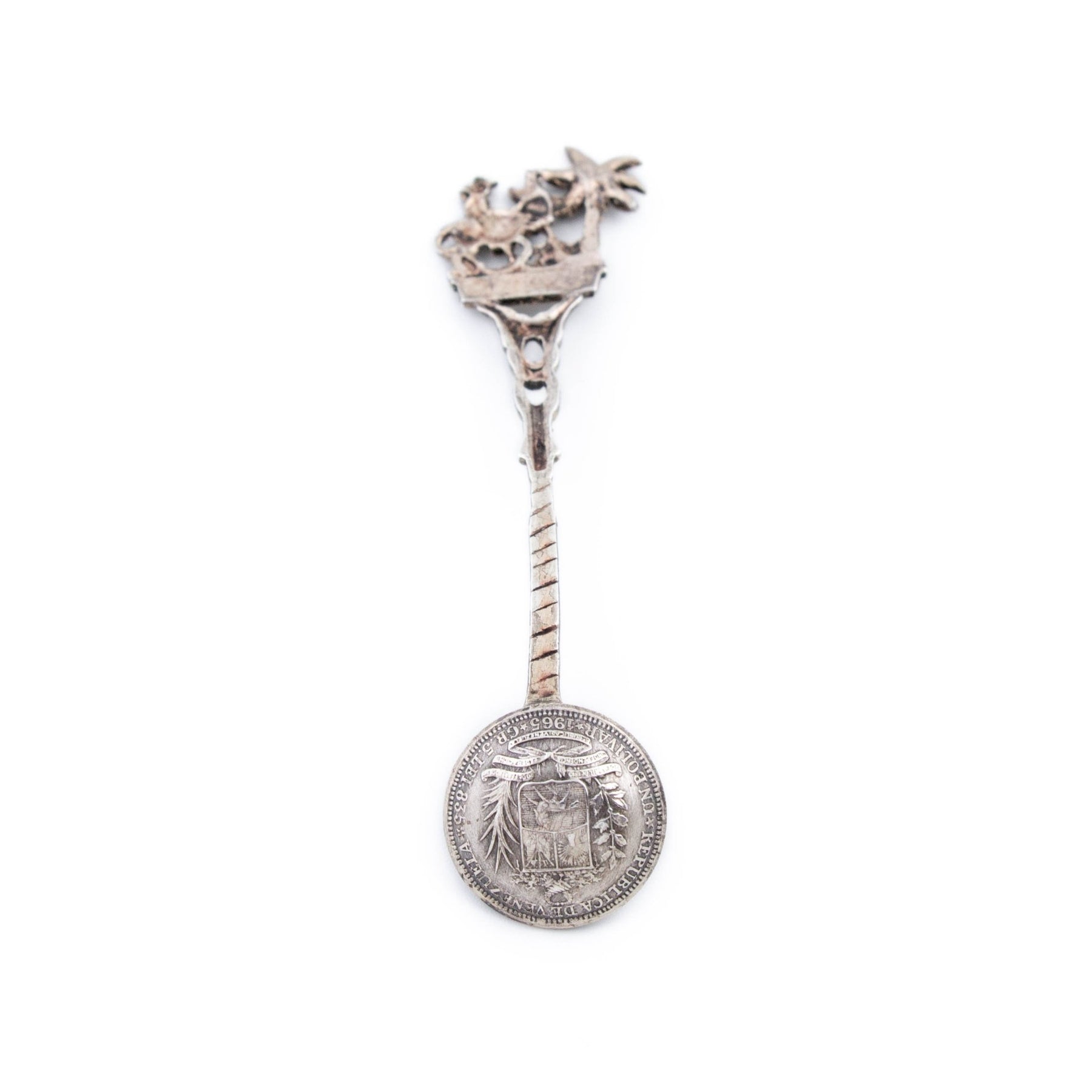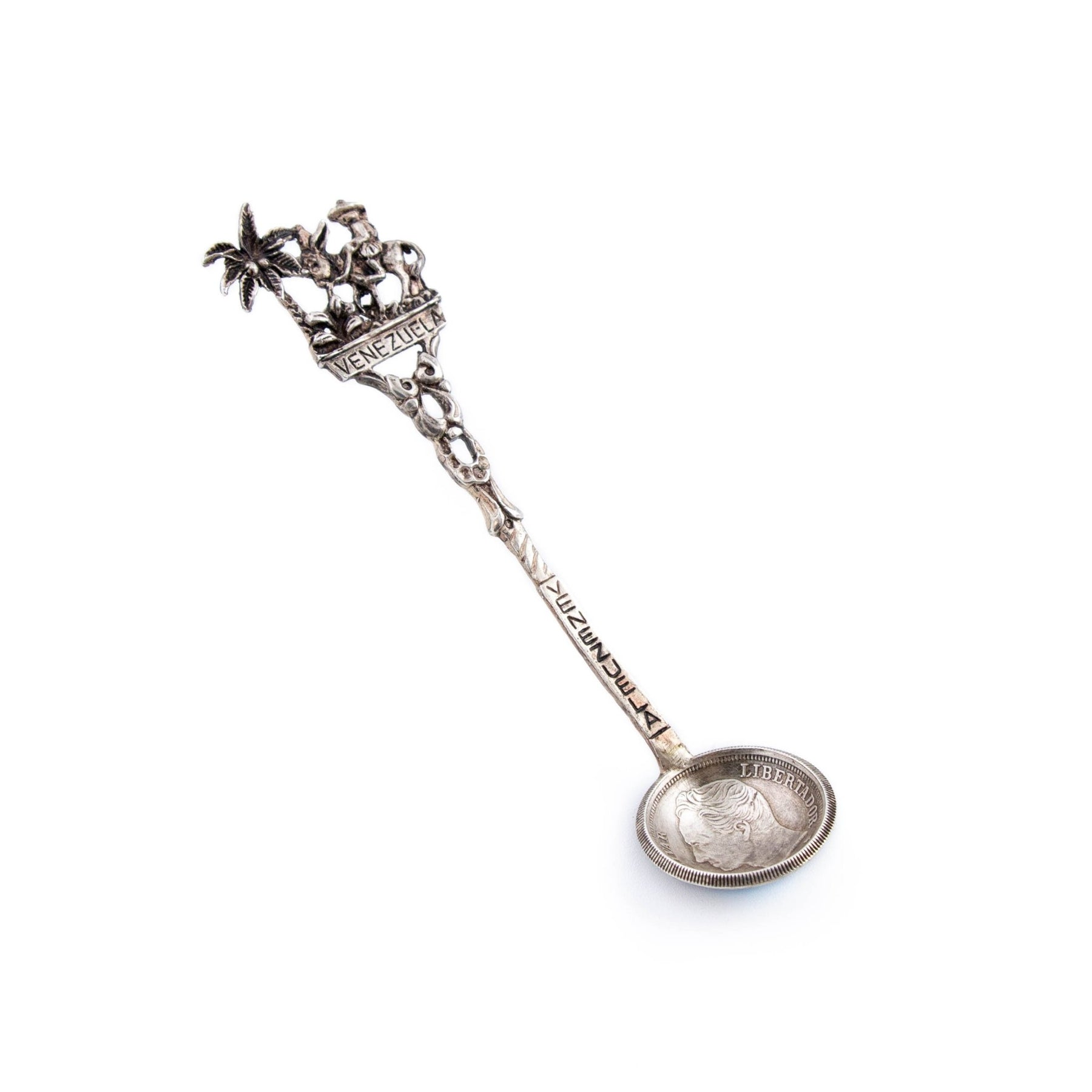 Antique 1910's patinated silver spoon featuring a design of a palm tree with a man riding a donkey. The spoon is made of a coin. An incredible piece of Venezulan history.
