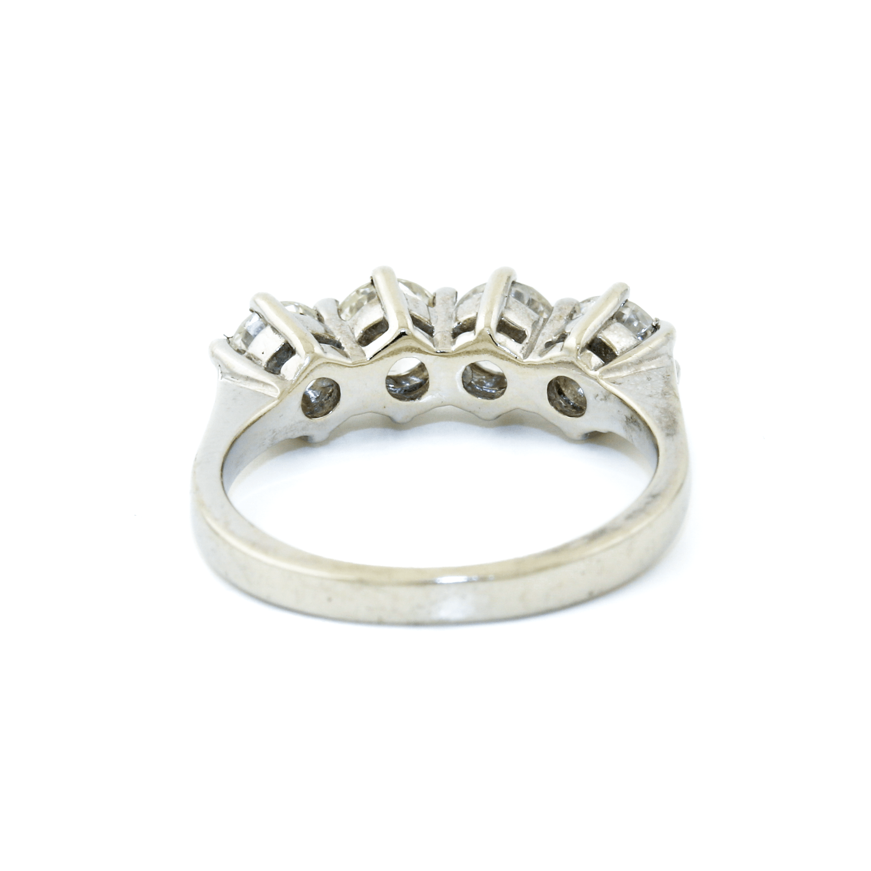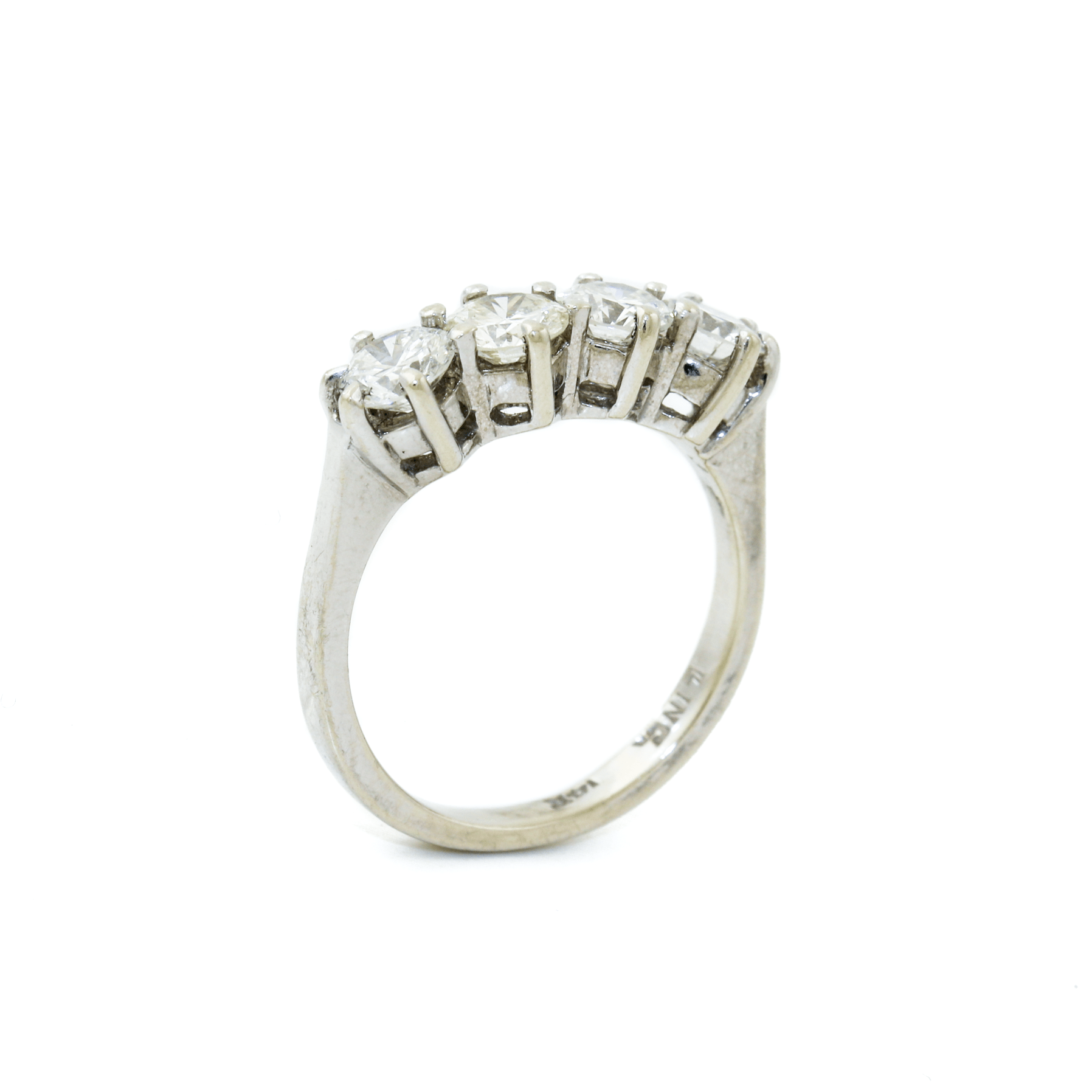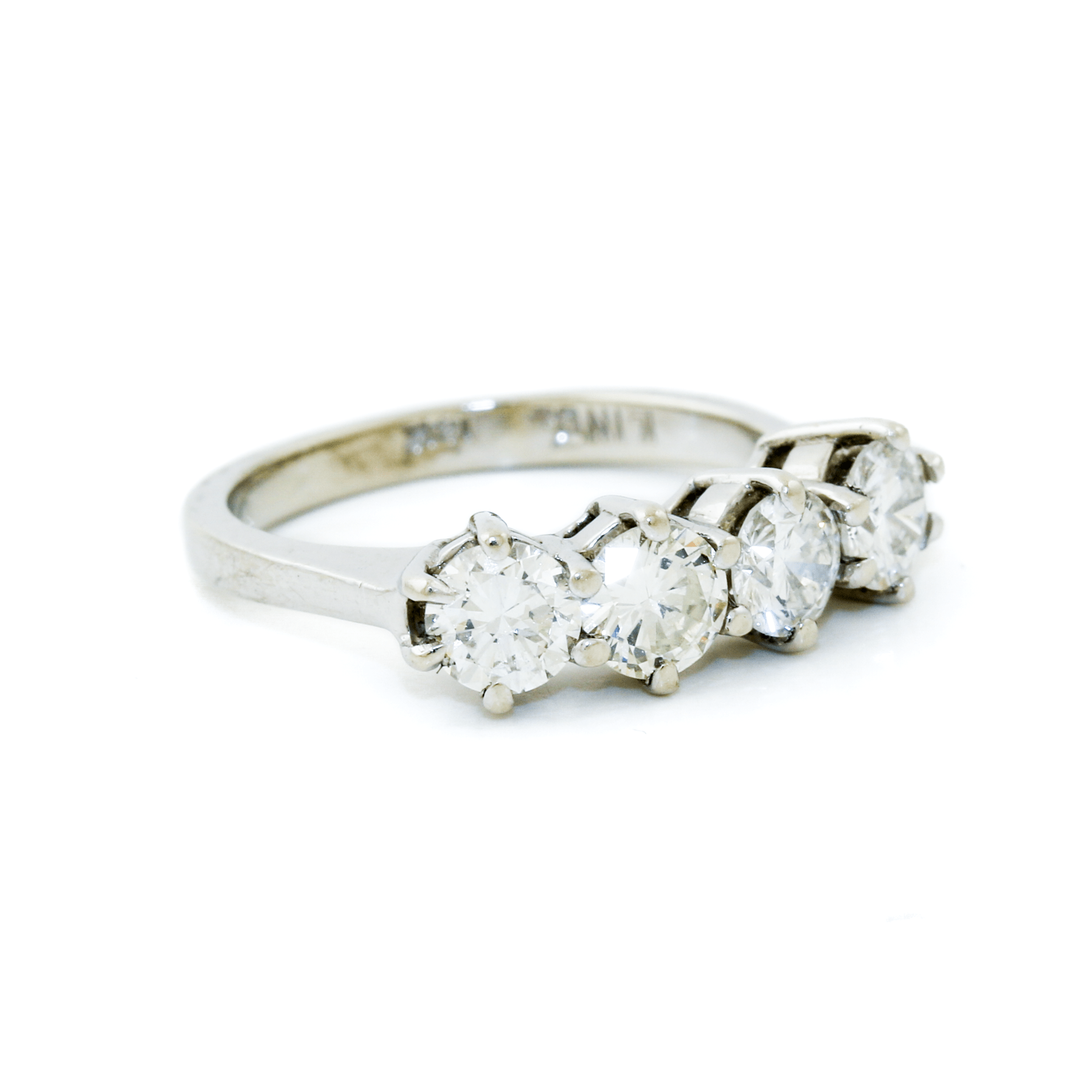 Designed to make a statement, this 14K White Gold ring features a stunning series of four round-cut diamonds, totaling 1.75 carats. Each diamond is securely set in bold, large prongs, allowing for maximum light exposure and brilliance. The classic white gold band provides a sleek and timeless backdrop, enhancing the radiance of the diamonds.