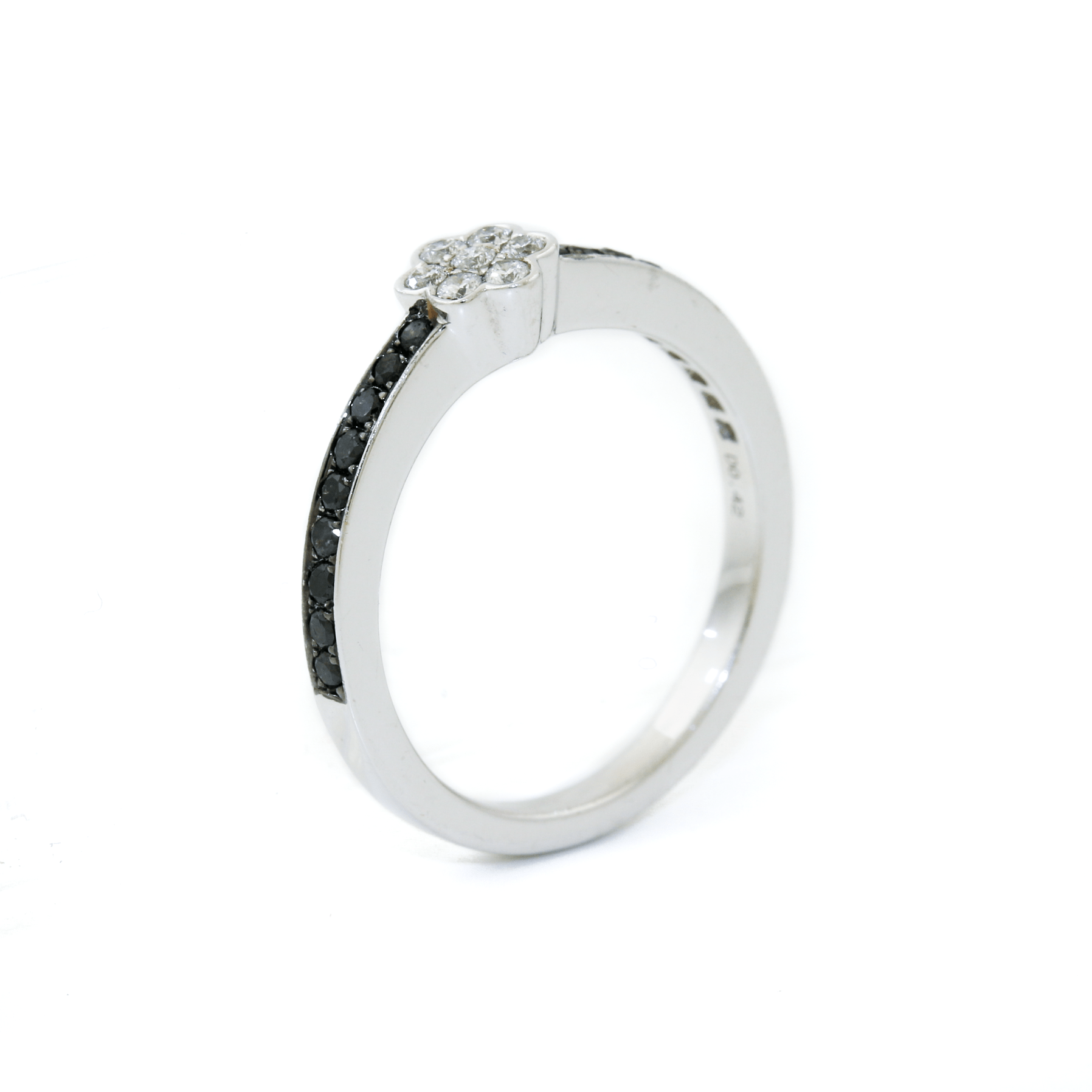 Sleek, modern, and undeniably elegant, this 18K White Gold Half-Eternity Band is a stunning fusion of contrast and brilliance. A bold 0.29-carat channel of black diamonds runs through the center, exuding a sophisticated edge. Complementing this striking design, 0.13 carats of round white diamonds are arranged in a delicate clover configuration, adding a touch of timeless charm and brilliance.
