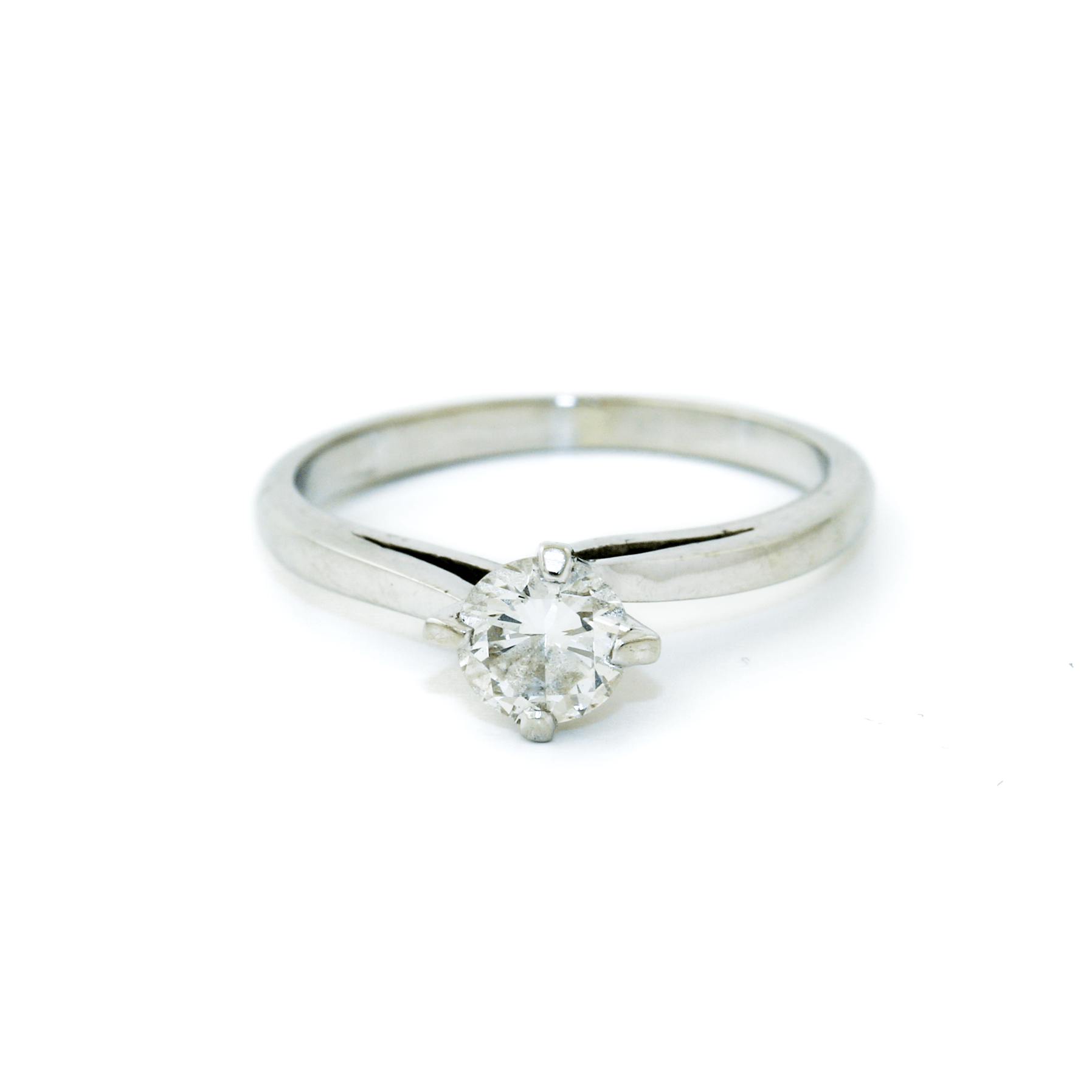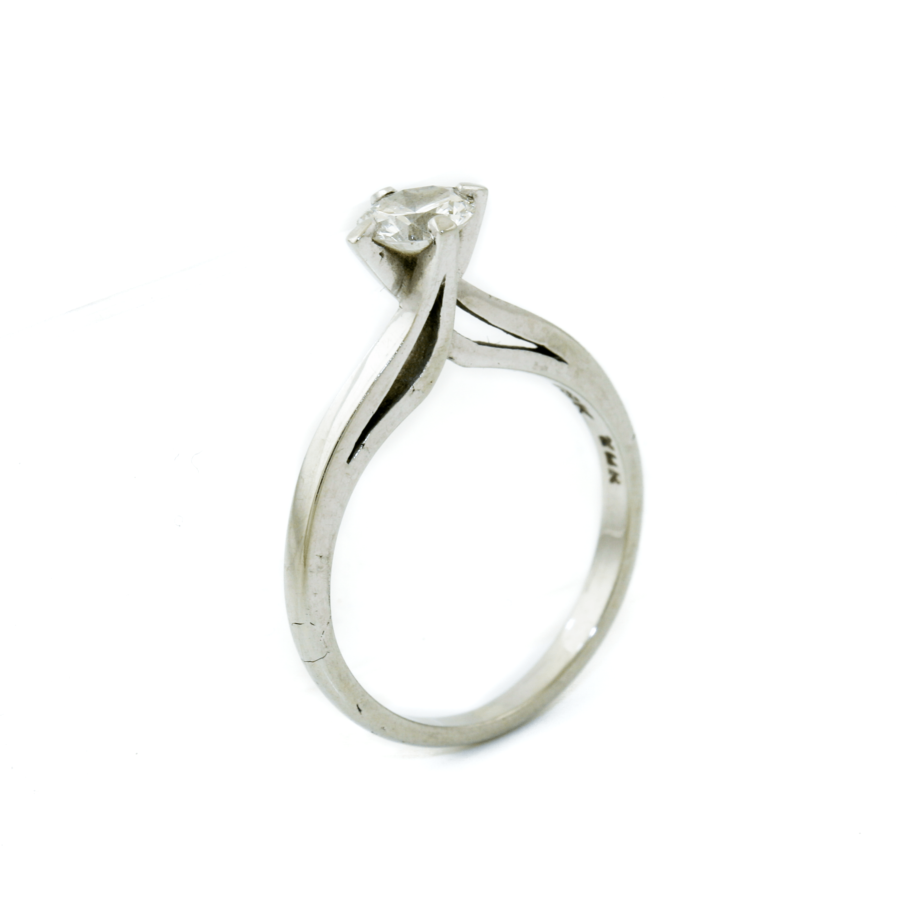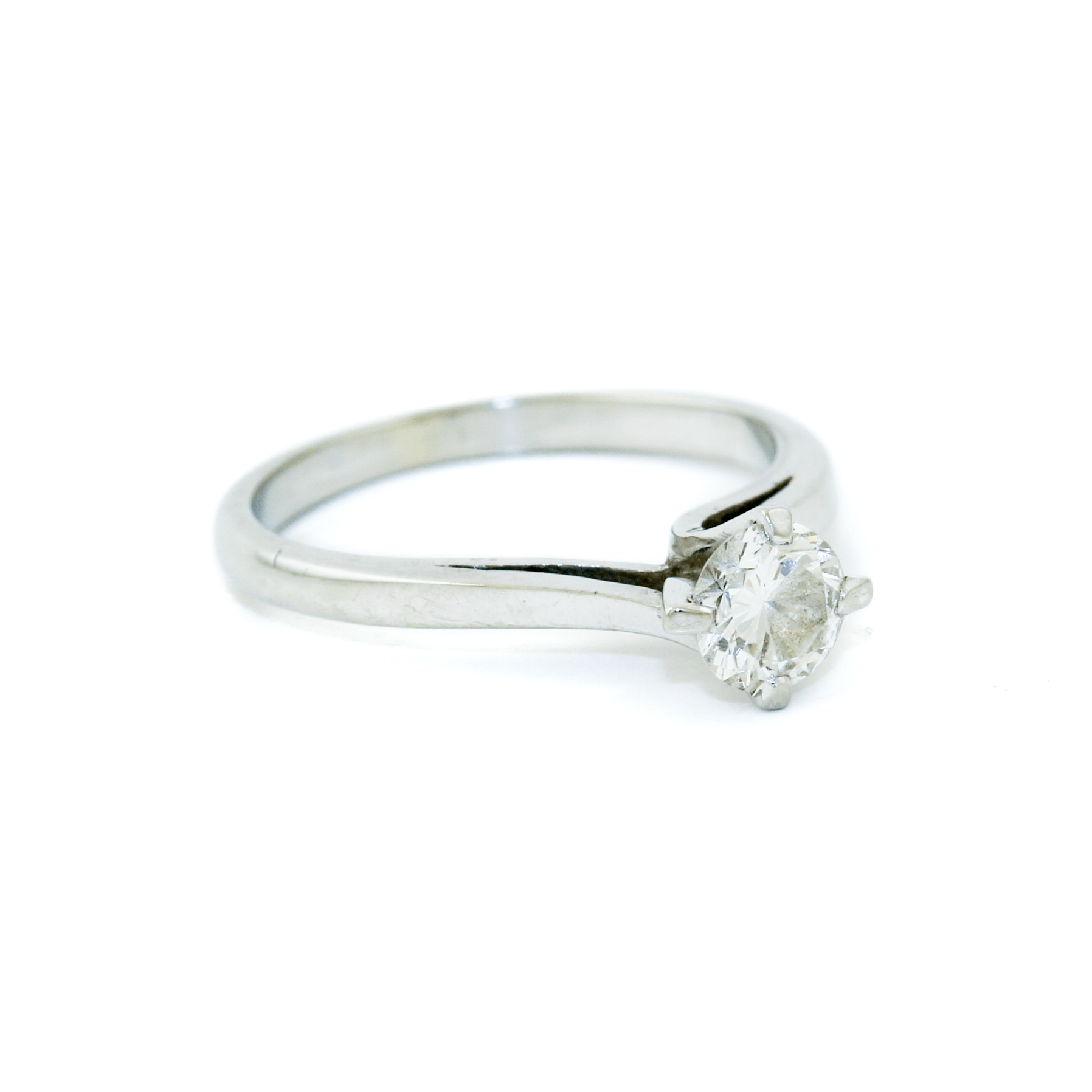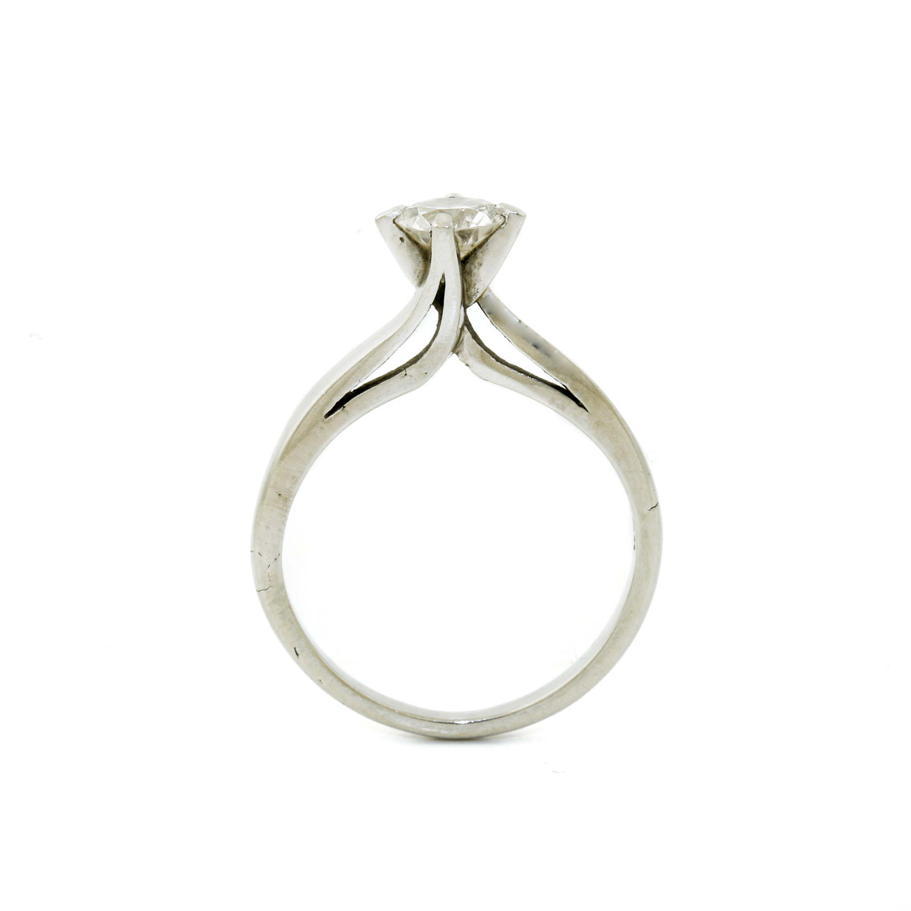 Timeless in its elegance, this vintage 18K white gold ring showcases a mesmerizing round-cut diamond in a refined solitaire setting. The delicate yet sculptural band gracefully intertwines, drawing attention to the brilliance of the diamond while adding an artistic touch to its silhouette.